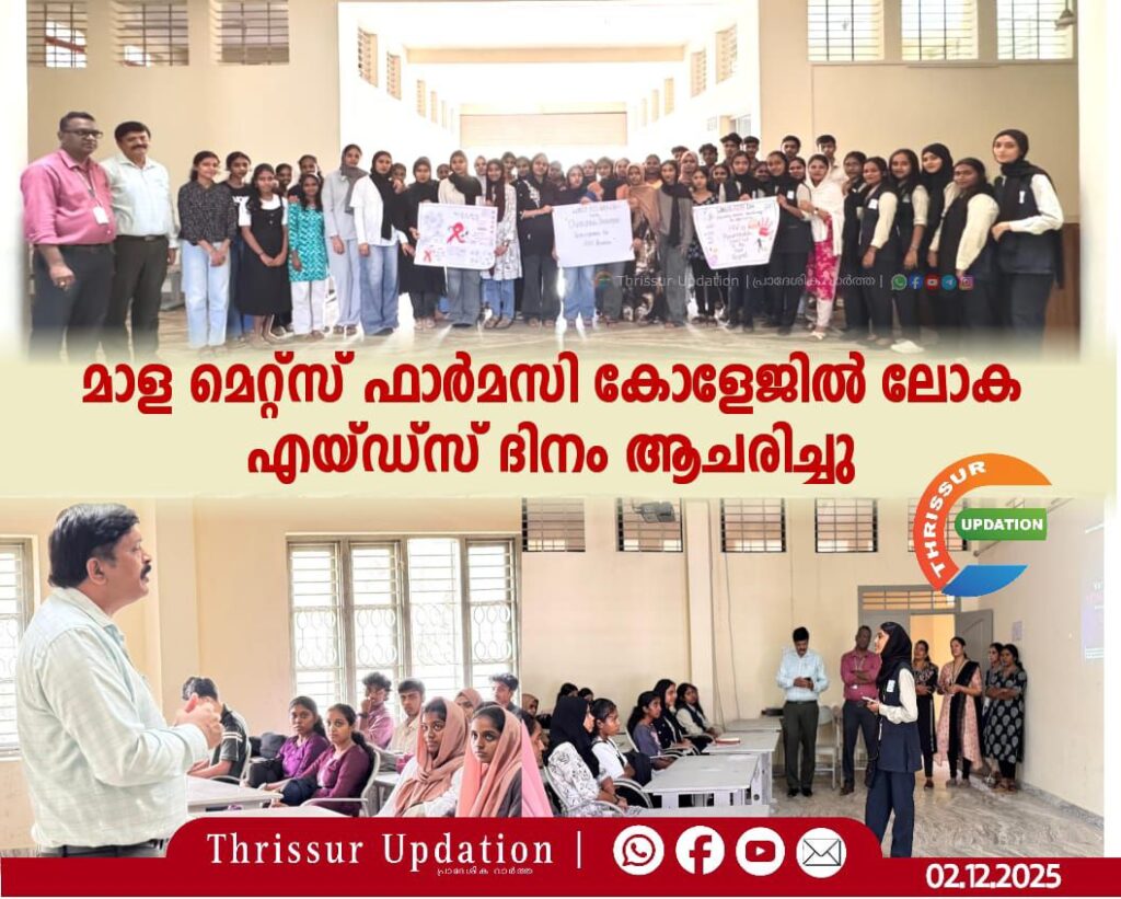 ലോകാരോഗ്യ സംഘടന വിഭാവനം ചെയ്ത ലോക എയ്ഡ്സ് ദിന സന്ദേശമായ ‘തടസ്സങ്ങളെ മറികടക്കുക, എയ്ഡ്സ് പ്രതികരണത്തെ പരിവർത്തനം ചെയ്യുക’ എന്ന തീമിൽ തൃശ്ശൂർ മാള മെറ്റ്സ് കോളേജ് ഓഫ് ഫാർമസ്യൂട്ടിക്കൽ സയൻസസ് & റിസർച്ചിൽ എച്ച്ഐവി-എയ്ഡ്സ് അവബോധ പരിപാടി സംഘടിപ്പിച്ചു. എയ്ഡ്സ് പകർച്ചവ്യാധിയുടെ നിലവിലെ സ്ഥിതി അറിയിക്കുക, എച്ച്ഐവി പ്രതിരോധം, ചികിത്സ, പരിചരണ മേഖലകളിൽ പുരോഗതി എന്നിവ ജനങ്ങളിൽ എത്തിക്കുകയാണ് ലോക എയ്ഡ്സ് ദിന ആചരണത്തിന്റെ ലക്ഷ്യം. കോളേജ് പ്രിൻസിപ്പൽ പ്രൊഫ. (ഡോ.) ഷാജി ജോർജ് പരിപാടി ഉദ്ഘാടനം ചെയ്തു. എച്ച് ഐ വി, എയ്ഡ്സ് തുടങ്ങിയ വിഷയങ്ങളിൽ യുവജനങ്ങളെ പ്രത്യേകിച്ച് വിദ്യാർത്ഥികളെ ബോധവൽക്കരിക്കേണ്ടതിൻ്റെ ആവശ്യകത അദ്ദേഹം ഉദ്ഘാടന പ്രസംഗത്തിൽ വിശദീകരിച്ചു. ഫാർമസ്യൂട്ടിക്കൽ കെമിസ്ട്രി വിഭാഗം മേധാവി പ്രൊഫ. (ഡോ.) പ്രശാന്ത് ഫ്രാൻസിസ് എയ്ഡ്സ് തടയൽ രീതികളും രോഗവ്യാപനം ഇല്ലാതാക്കുന്നതിനുള്ള എല്ലാവരുടെയും ഉത്തരവാദിത്തവും വിശദീകരിച്ചു. മൂന്നാം സെമസ്റ്റർ ബി. ഫാം. വിദ്യാർത്ഥിനി ബിഷാര റഷീദും ആദ്യ സെമസ്റ്റർ വിദ്യാർത്ഥിനി സാറ മൻസൂറും പ്രഭാഷണം നടത്തി. അവർ എയ്ഡ്സ് രോഗികൾക്ക് മാനസിക പിന്തുണയുടെ പ്രാധാന്യം ഊന്നിപ്പറഞ്ഞു. ആദ്യ സെമസ്റ്റർ വിദ്യാർത്ഥിനി അദിലത്തുൽ ഹസ്ന ഹൃദയസ്പർശിയായ ഗാനം ആലപിച്ചു. എയ്ഡ്സ് പ്രതിരോധത്തിനായി പ്രവർത്തിക്കുവാനുള്ള സംയുക്ത പ്രതിജ്ഞയും എച്ച്ഐവി / എയ്ഡ്സ് ബോധവൽക്കരണ മൈം പ്രദർശനവും നടത്തി പരിപാടി സമാപിച്ചു.
