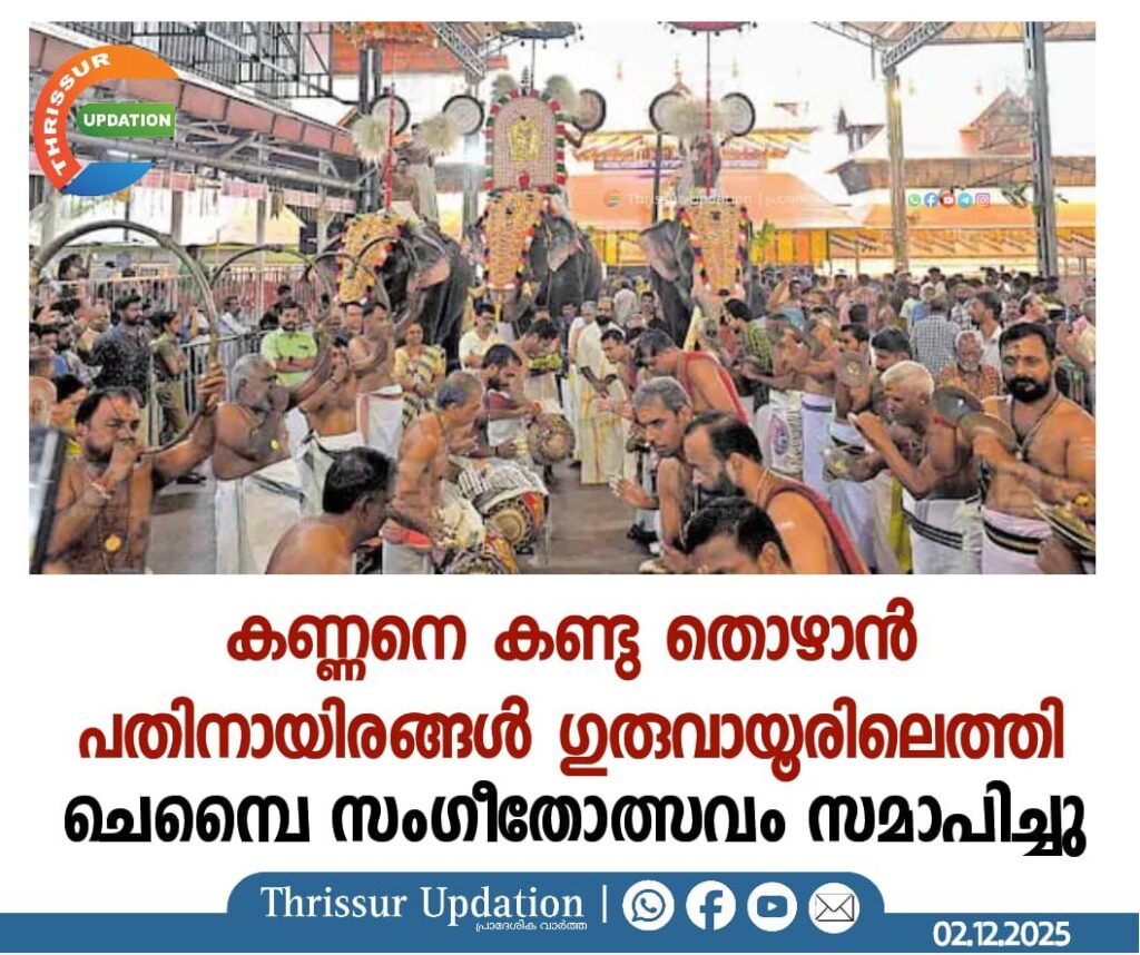 ഏകാദശിയുടെ പുണ്യം നുകരാൻ, കണ്ണനെ കണ്ടു തൊഴാൻ പതിനായിരങ്ങൾ ഗുരുവായൂരിലെത്തി. അർധരാത്രി മുതൽ കൂത്തമ്പലത്തിൽ വേദജ്ഞർക്ക് ദ്വാദശിപ്പണം സമർപ്പിച്ച് ഭക്തർ അനുഗ്രഹം തേടി. സുപ്രീം കോടതിയുടെ നിർദേശപ്രകാരം ഉദയാസ്തമയ പൂജയോടെയാണ് ഏകാദശി ആഘോഷിച്ചത്. കാലത്തെ ശീവേലിക്കു ശേഷം ചടങ്ങ് തുടങ്ങി. ഓരോ 5 പൂജ കഴിയുമ്പോഴും ഭക്തർക്ക് ദർശനത്തിന് അവസരം നൽകി.കാലത്ത് കാഴ്ചശീവേലിക്ക് കൊമ്പൻ ഇന്ദ്രസെൻ സ്വർണക്കോലം എഴുന്നള്ളിച്ചു. തിരുവല്ല രാധാകൃഷ്ണന്റെ പ്രമാണത്തിൽ പഞ്ചാരിമേളം അകമ്പടിയായി.പാർഥസാരഥി ക്ഷേത്രത്തിലേക്കുള്ള എഴുന്നള്ളിപ്പിൽ കൊമ്പൻ ശ്രീധരൻ കോലം എഴുന്നള്ളിച്ചു. പല്ലശ്ശന മുരളി പഞ്ചവാദ്യം നയിച്ചു. ഏകാദശി വ്രത വിഭവങ്ങളോടെയുള്ള പ്രസാദ ഊട്ടിൽ 35,000ത്തിലേറെ ഭക്തർ പങ്കെടുത്തു. സന്ധ്യയ്ക്ക് പാർഥസാരഥി ക്ഷേത്രത്തിൽ നിന്ന് ഗീതാദിന ശ്രീകൃഷ്ണ രഥം എഴുന്നള്ളിച്ചു. വടക്കേനടയിൽ പൈതൃകം ഗുരുവായൂർ ദീപക്കാഴ്ച ഒരുക്കി. 15 ദിവസത്തെ ചെമ്പൈ സംഗീതോത്സവം ചെമ്പൈയുടെ ഇഷ്ട കീർത്തനങ്ങൾ പാടി രാത്രി സമാപിച്ചു. ഏകാദശിക്കും ചെമ്പൈ സംഗീതോത്സവത്തിനും പ്രയത്നിച്ചവർക്ക് ദേവസ്വം ഉപഹാരം നൽകി. ഇന്നു കാലത്ത് 7 മുതൽ 11 വരെ ഭക്തർക്ക് ദ്വാദശി ഊട്ട് നൽകും. ഇന്നു കാലത്ത് 8ന് ക്ഷേത്ര നടയടച്ചാൽ വൈകിട്ട് 4ന് മാത്രമേ തുറക്കൂ. നടയടച്ച സമയത്ത് ദർശനം, വിവാഹം, ചോറൂണ്, വാഹന പൂജ വഴിപാടുകൾ ഉണ്ടാകില്ല.
