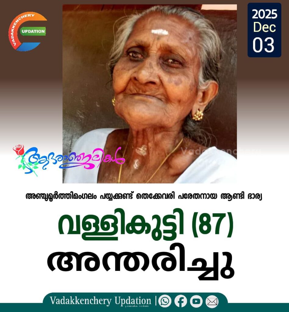 അഞ്ചുമൂർത്തി മംഗലം പയ്യക്കുണ്ട് തെക്കേവരി പരേതനായ ആണ്ടി ഭാര്യ വള്ളികുട്ടി (87)അന്തരിച്ചു. സംസ്ക്കാരം ഇന്ന് (0 3-12-2025 ബുധനാഴ്ച്ച) കാലത്ത് 11മണിക്ക് തിരുവില്ലാമല ഐവർ മഠത്തിൽ.