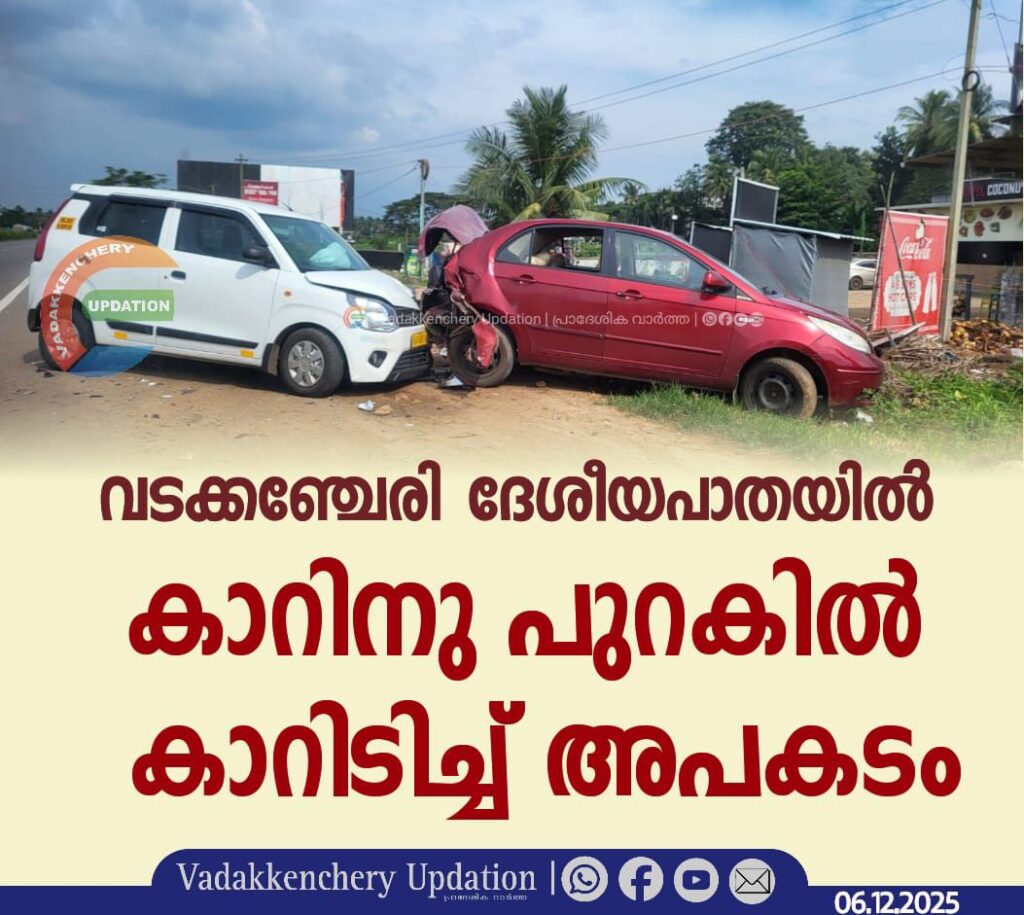 വടക്കഞ്ചേരി ദേശീയപാത 544-ൽ റോയൽ ജംഗ്ഷന് സമീപം രണ്ട് കാറുകൾ തമ്മിൽ കൂട്ടിയിടിച്ചുണ്ടായ അപകടത്തിൽ കുട്ടികൾ ഉൾപ്പെടെ യാത്രക്കാർക്ക് ചെറിയ പരിക്കുകളേറ്റു. റോഡ്സൈഡിൽ പാർക്ക് ചെയ്ത നിലയിലുള്ള കാറിലേക്ക് പാലക്കാട് ദിശയിൽ നിന്നും എത്തിയ കാർ ഇടിച്ചാണ് അപകടം സംഭവിച്ചത്.