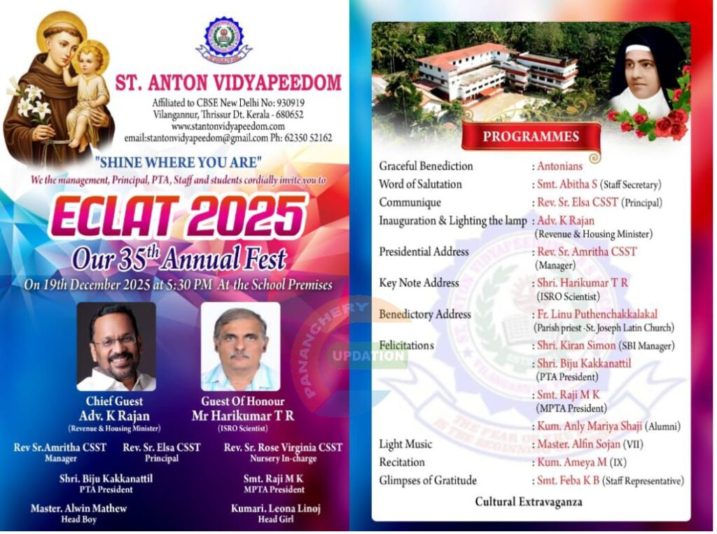 വിലങ്ങന്നൂർ സെന്റ് ആന്റൺ വിദ്യാപീഠത്തിൽ 35-ാംമത് വാർഷികാഘോഷം (ECLAT 2025) ഡിസംബർ 19ന്