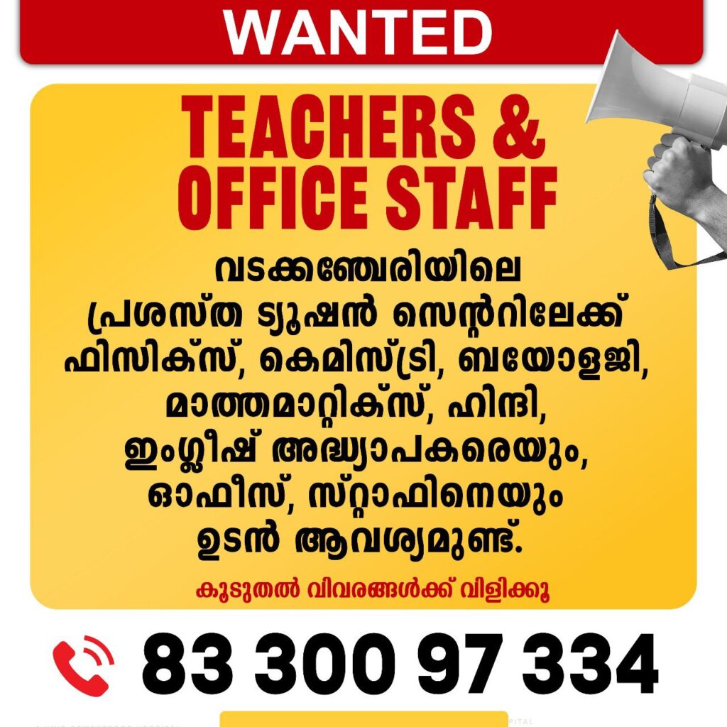 വടക്കഞ്ചേരിയിലെ പ്രശസ്ത ട്യൂഷൻ സെൻ്ററിലേക്ക് ഫിസിക്സ്, കെമിസ്ട്രി, ബയോളജി, മാത്തമാറ്റിക്സ്, ഹിന്ദി, ഇംഗ്ലീഷ് അദ്ധ്യാപകരെയും, ഓഫീസ്, സ്റ്റാഫിനെയും ഉടൻ ആവശ്യമുണ്ട്.