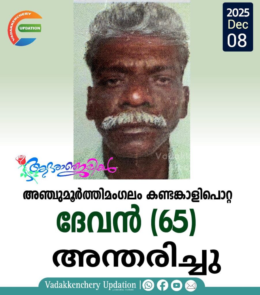 അഞ്ചുമൂർത്തിമംഗലം കണ്ടങ്കാളിപൊറ്റ ദേവൻ (65) അന്തരിച്ചു. സംസ്കാരം ഇന്ന് (08-12-2025-തിങ്കളാഴ്ച) 3 മണിക്ക് കണ്ടങ്കാളിപൊറ്റ പൊതു ശ്മശാനത്തിൽ.
