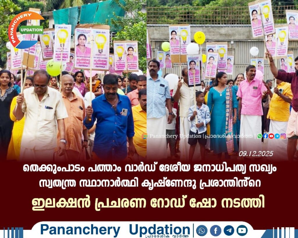 തെക്കുംപാടം പത്താം വാർഡ് ദേശീയ ജനാധിപത്യ സഖ്യം സ്വതന്ത്ര സ്ഥാനാർത്ഥി കൃഷ്ണേന്ദു പ്രശാന്തിൻ്റെ ഇലക്ഷൻ പ്രചരണ റോഡ് ഷോ നടത്തി