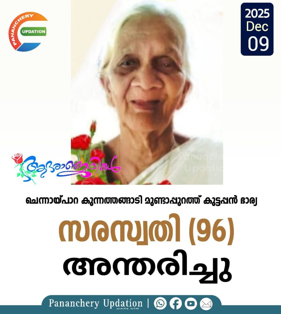 ചെന്നായ്പാറ കുന്നത്തങ്ങാടി മുണ്ടാപ്പുറത്ത് കുട്ടപ്പൻ ഭാര്യ സരസ്വതി (96) അന്തരിച്ചു