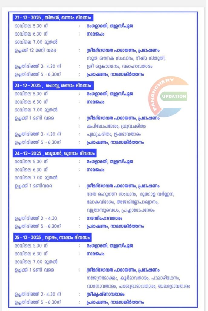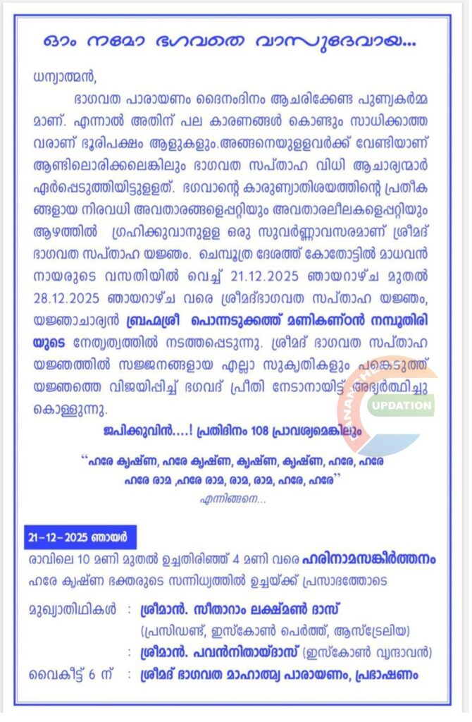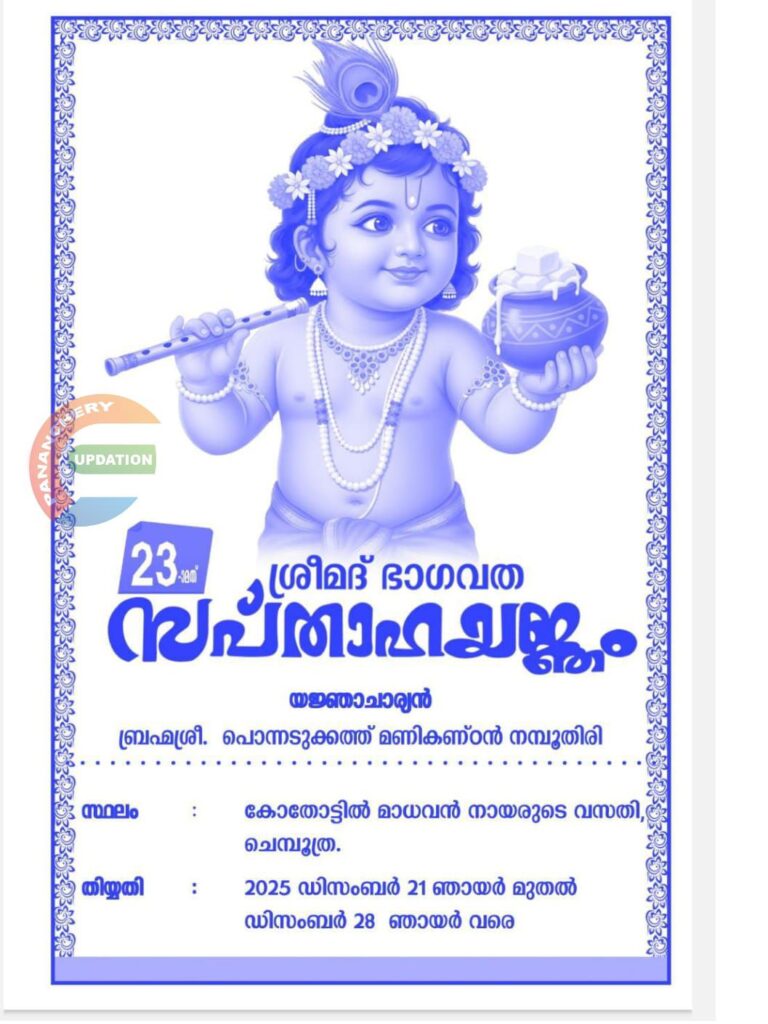 23-ാം മത് ശ്രീമദ് ഭാഗവത സപ്താഹജഞം ചെമ്പൂത്ര കോതോട്ടിൽ മാധവൻ നായരുടെ വസതിയിൽ ഡിസംബർ 21 മുതൽ 28 വരെ