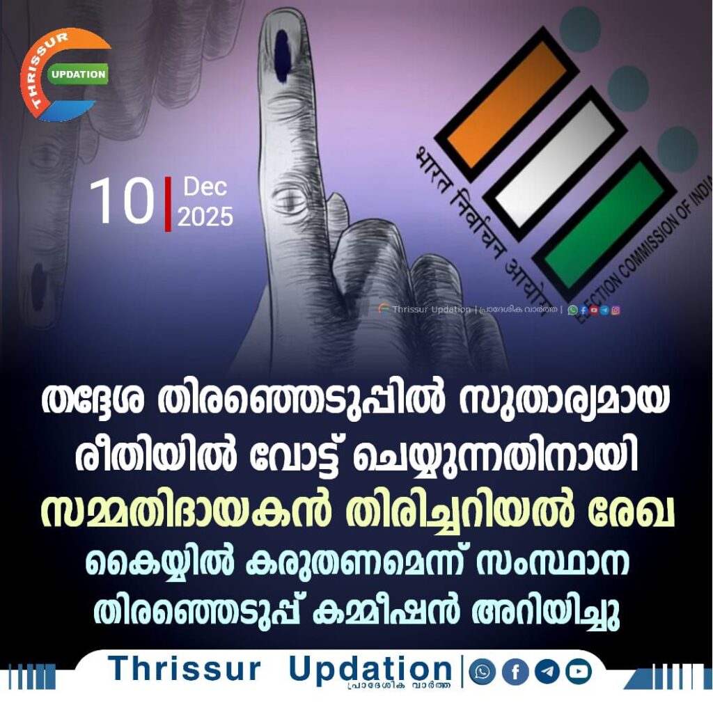 കേന്ദ്ര തിരഞ്ഞെടുപ്പ് കമ്മീഷന് നല്കിയിട്ടുള്ള വോട്ടര് തിരിച്ചറിയല് കാര്ഡ്, സംസ്ഥാന തിരഞ്ഞെടുപ്പ് കമ്മീഷന് നല്കിയിട്ടുള്ള വോട്ടര് സ്ലിപ്പ്, പാസ്സ്പോര്ട്ട്, ഡ്രൈവിംഗ് ലൈസന്സ്, പാന് കാര്ഡ്, ആധാര് കാര് ഡ്, ഫോട്ടോ പതിച്ച എസ്.എസ്.എല്.സി സര്ട്ടിഫിക്കറ്റ്/ബുക്ക് ഏതെങ്കിലും ദേശസാല്കൃത ബാങ്കില്നിന്നും തിരഞ്ഞെടുപ്പ് തീയതിക്ക് ആറു മാസക്കാലയളവിന് മുന്പ് വരെ നല്കിയിട്ടുള്ള ഫോട്ടോ പതിച്ച പാസ് ബുക്ക് എന്നിവയില് ഏതെങ്കിലും ഒരെണ്ണം തിരിച്ചറിയല് രേഖയായി ഹാജരാക്കാം.തദ്ദേശ തിരഞ്ഞെടുപ്പ് വോട്ടെടുപ്പ് ദിവസം വോട്ടര്മാര് വോട്ടിങ് നടപടിക്രമങ്ങള് കൃത്യമായി പാലിച്ച് വോട്ടവകാശം വിനിയോഗിക്കണമെന്ന് സംസ്ഥാന തിരഞ്ഞെടുപ്പ് കമ്മീഷണര് എ. ഷാജഹാന് അഭ്യര്ത്ഥിച്ചു.