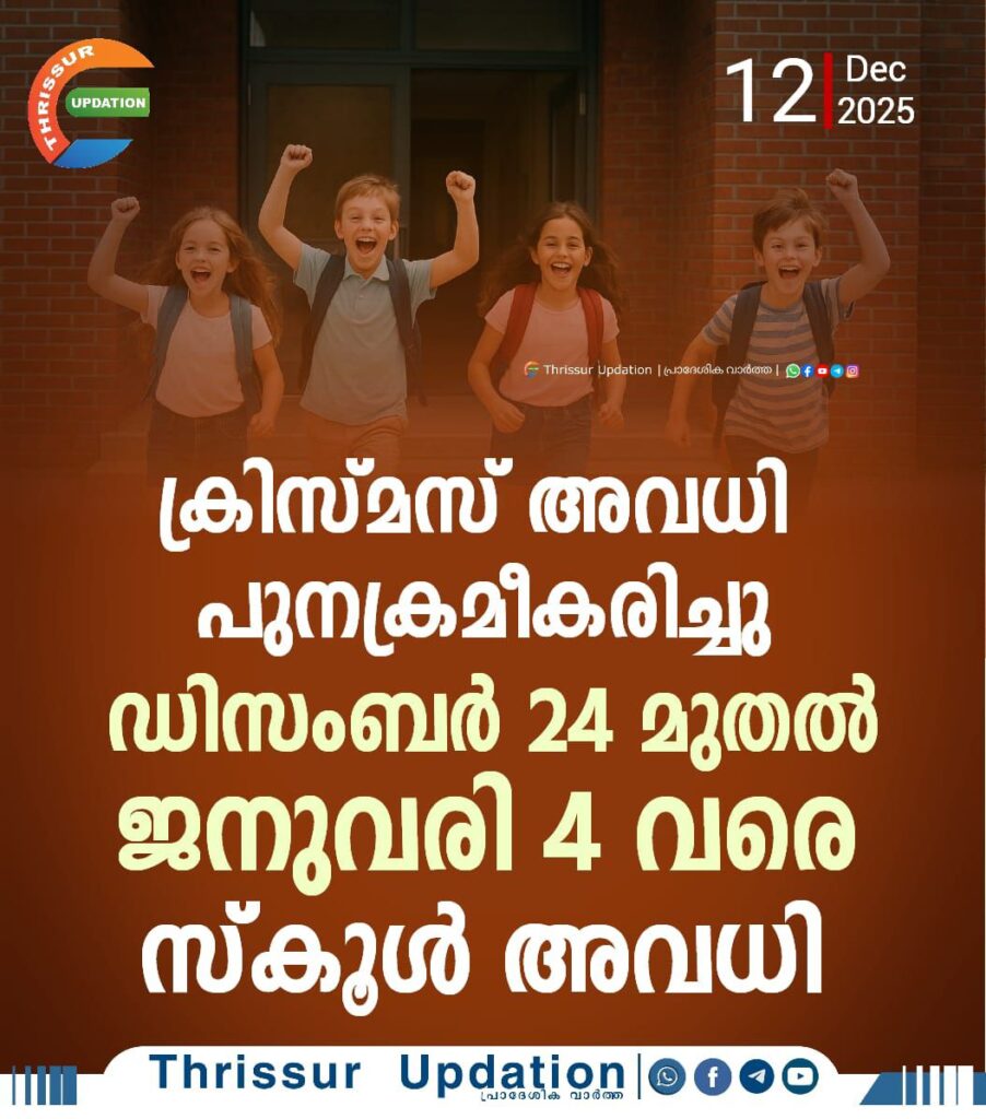 ക്രിസ്മസ് അവധി പുനക്രമീകരിച്ച് സർക്കാർ. സ്കൂൾ അടയ്ക്കുന്നത് ഒരു ദിവസം നീട്ടി. ഡിസംബർ 24 മുതൽ ജനുവരി 4 വരെയാണ് സ്കൂളുകൾക്ക് അവധി പ്രഖ്യാപിച്ചിരിക്കുന്നത്. അർധവാർഷിക പരീക്ഷയ്ക്ക് ശേഷം 23 നാണ് സ്കൂൾ അടയ്ക്കുക. അവധിയ്ക്ക് ശേഷം സ്കൂൾ തുറക്കുക ജനുവരി 5 നായിരിക്കുമെന്ന് പൊതുവിദ്യാഭ്യാസ വകുപ്പ് വ്യക്തമാക്കി. പതിവില് നിന്ന് വ്യത്യസ്തമായി ഇത്തവണ ക്രിസ്മസിന് 12 ദിവസങ്ങളാണ് കുട്ടികള്ക്ക് അവധി ലഭിക്കുക. സാധാരണ വര്ഷങ്ങളില് 10 ദിവസമാണ് ക്രിസ്മസ് അവധി ഉണ്ടായിരിക്കുക.അതേസമയം, തദ്ദേശ തെരഞ്ഞെടുപ്പിൻ്റെ പശ്ചാത്തലത്തിൽ ക്രിസ്മസ് പരീക്ഷ തീയതിയിൽ മാറ്റം വരുത്തിയതിനാലാണ് അവധികളുടെ എണ്ണം വർധിച്ചിരിക്കുന്നത്. ഡിസംബർ 15 ന് ആരംഭിച്ച ക്രിസ്മസ് പരീക്ഷകള് 23 നാണ് അവസാനിക്കുക.