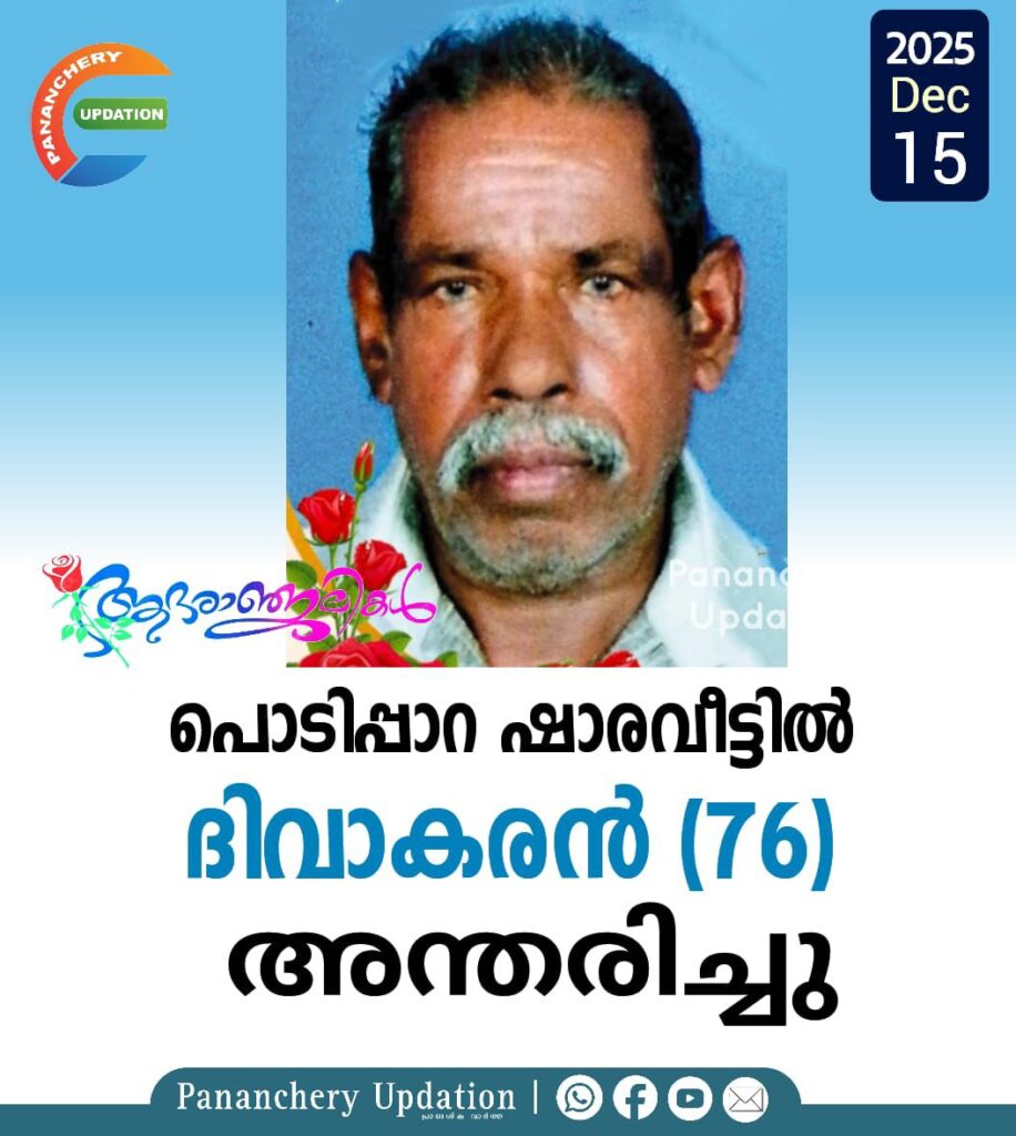 പൊടിപ്പാറ ഷാരവീട്ടിൽ ദിവാകരൻ (76) അന്തരിച്ചു. സംസ്ക്കാരം ഇന്ന്(15-12-2025 -തിങ്കൾ) 3 ന് വടക്കുംപാടം ആത്മാലയത്തിൽ. ഭാര്യ: ശാന്ത മക്കൾ: ബിന്ദു, ബിനൊ മരുമക്കൾ: സലി, ആശ.