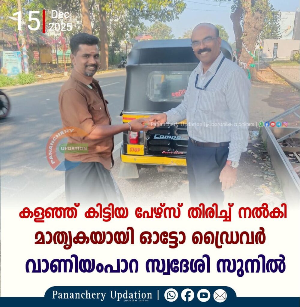 കളഞ്ഞ് കിട്ടിയ പേഴ്സ് തിരിച്ച് നൽകി മാതൃകയായി ഓട്ടോ ഡ്രൈവർ വാണിയംപാറ സ്വദേശി സുനിൽ