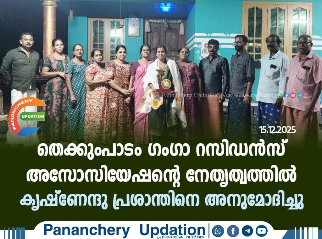 പാണഞ്ചേരി ഗ്രാമപഞ്ചായത്ത് തെക്കുംപാടം പത്താം വാർഡിൽ നിന്നും വിജയിച്ച കൃഷ്ണേന്ദു പ്രശാന്തിനെ തെക്കുംപാടം ഗംഗാ റസിഡൻസ് അസോസിയേഷൻ പൊന്നാട അണിയിച്ചും മൊമെന്റോ നൽകിയും അനുമോദിച്ചു. പ്രസിഡന്റ് വലിയ വീട്ടിൽ മനോഹരൻ അധ്യക്ഷത വഹിച്ചു. സെക്രട്ടറി സജിതാ രാജേന്ദ്രൻ, സനോജ് പാലന്തല എന്നിവർ സംസാരിച്ചു.