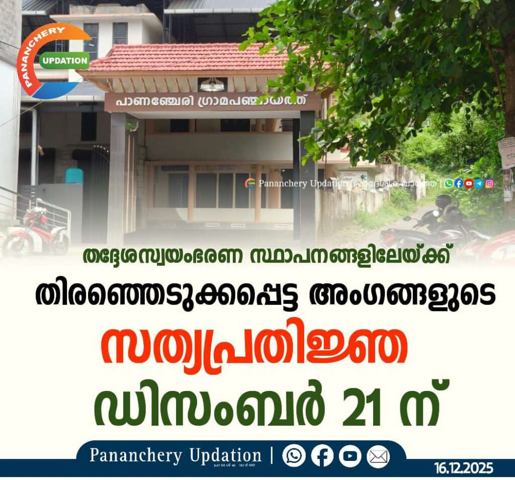 പാണഞ്ചേരി പഞ്ചായത്ത് പുതിയ ഭരണസമിതി ഡിസംബർ 21 ഞായറാഴ്ച രാവിലെ 10മണിക്ക് സത്യപ്രതിജ്ഞ ചൊല്ലും. 13അംഗ ഭൂരിപക്ഷത്തോടെ UDF പഞ്ചായത്ത് അധികാരം സ്വന്തമാക്കി. 10അംഗങ്ങളുമായി LDF ശക്തമായ പ്രതിപക്ഷത്തോടെ പഞ്ചായത്തിൽ ഉണ്ടാവും. അതുപോലെ NDA സ്വതന്ത്രയായി തെക്കുംപാടത്തു നിന്നും ഒരാളും ഉണ്ടാകും. ഇനിയുള്ള ചോദ്യം ആർ പഞ്ചായത്തിന്റെ ചുക്കാൻ പിടിക്കും എന്നുള്ളതാണ്.UDF ൽ 7വനിതകൾ 6ആണുങ്ങൾ.ശക്തമായ ഒരു പ്രസിഡന്റ് അതും വനിതാ വിഭാഗത്തിൽ നിന്നുമുണ്ടാകും എന്ന് തന്നെ പ്രതീക്ഷിക്കാം.