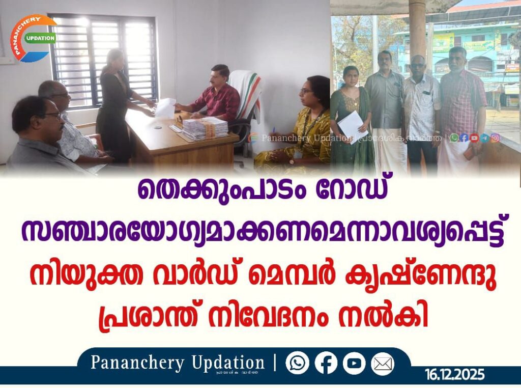തെക്കുംപാടം റോഡ് സഞ്ചാരയോഗ്യമാക്കണമെന്നാവശ്യപ്പെട്ട് നിയുക്ത വാർഡ് മെമ്പർ കൃഷ്ണേന്ദു പ്രശാന്ത് നിവേദനം നൽകി