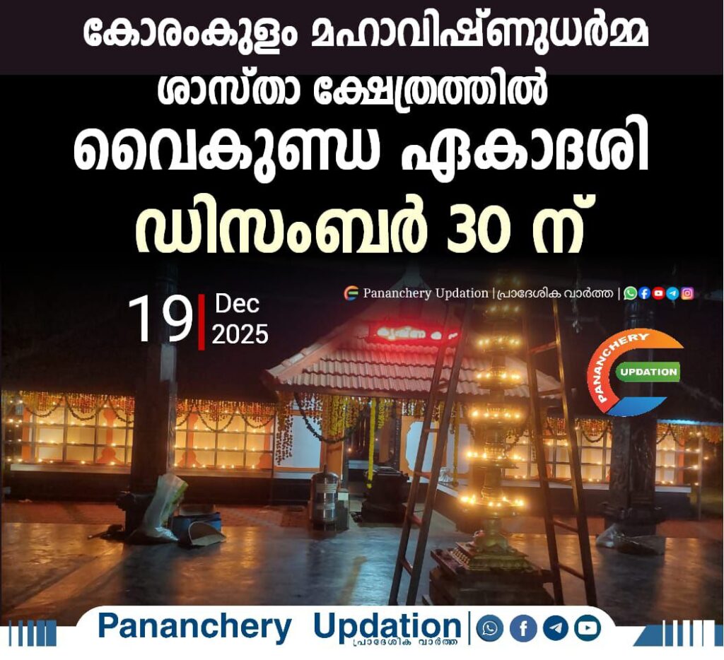 തെക്കുംപാടം കോരംകുളം മഹാവിഷ്ണുധർമ്മ ശാസ്താ ക്ഷേത്രത്തിൽ വൈകുണ്ഡ ഏകാദശി 2025 ഡിസംബർ ചൊവ്വാഴ്ച നടത്തുന്നു. വിശേഷാൽ പൂജകൾ, നിറമാല, ശ്രീകോവിലുകളിൽസമ്പൂർണ്ണ നെയ് വിളക്ക്, ചുറ്റുവിളക്ക് ,വിലെ 8 മണി മുതൽ വൈകീട്ട് 5 മണി വരെ സമ്പൂർണ്ണനാരായണീയ പാരായണം, വൈകീട്ട് 6.30 ന് നാമജപ പ്രദക്ഷിണം ഗോതമ്പ് കഞ്ഞി, തോരൻ പുഴുക്ക്,കാളൻ, അച്ചാർ തുടങ്ങിയ വിഭവങ്ങളോടുകൂടി ഉച്ചക്ക് 12.30 നും രാത്രി 8 നുംഏകാദശി ഊട്ട് ഉണ്ടായിരിക്കും , സമ്പൂർണ്ണ നെയ് വിളക്ക് തെളിയിക്കാൻ ഭക്തജനങ്ങൾക്ക് നെയ്യ് വഴി പാടായി സമർപ്പിക്കാവുന്നതാണ്. എല്ലാവരേയും ക്ഷേത്ര ദർശനത്തിലേക്കും ഏകദശി ഊട്ടിലേക്കും സ്നേഹപൂർവ്വം ക്ഷണിക്കുന്നതായി ഭാരവാഹികൾ അറിയിച്ചു.