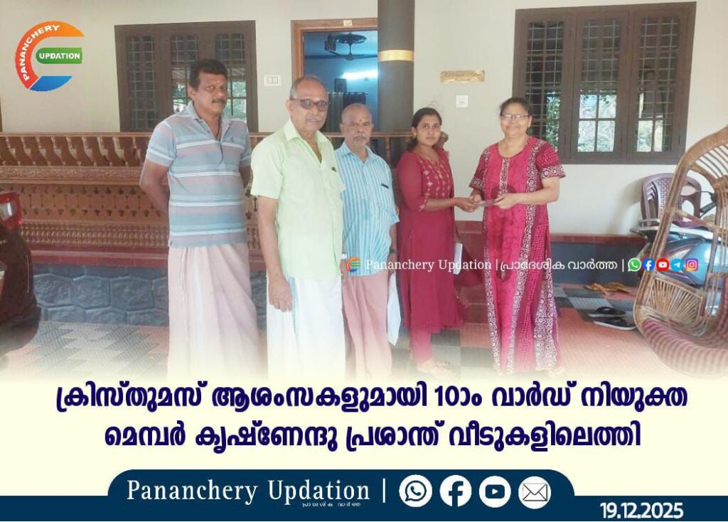 ക്രിസ്തുമസിനോടനുബന്ധിച്ച് 10ാം വാർഡ് നിയുക്ത മെമ്പർ കൃഷ്ണേന്ദു പ്രശാന്ത് ക്രിസ്തുമസ്–ന്യൂ ഇയർ ഗ്രീറ്റിംഗ് കാർഡുകളുമായി തമ്പുരാട്ടി പറമ്പിലെ വീടുകളിൽ നേരിട്ടെത്തി ആശംസകൾ നേർന്നു. വമ്പിച്ച ഭൂരിപക്ഷത്തോടെ വിജയിപ്പിച്ചതിന് വാർഡ് ജനങ്ങളോട് നന്ദി അറിയിച്ചുകൊണ്ടായിരുന്നു സന്ദർശനം.