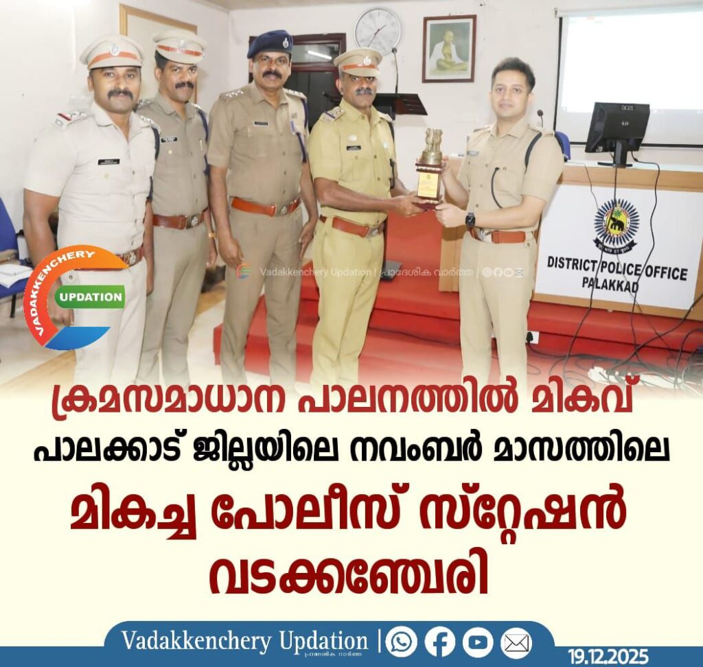2025 നവംബർ മാസത്തിലെ ക്രമസമാധാന പാലനത്തിൽ സംസ്ഥാനതല വിലയിരുത്തലിൽ മികച്ച പോലീസ് സ്റ്റേഷനായി വടക്കഞ്ചേരി പോലീസ് സ്റ്റേഷൻ തിരഞ്ഞെടുത്തു. നിയമപാലനത്തിലും പൊതുസുരക്ഷ ഉറപ്പാക്കുന്നതിലും നടത്തിയ കാര്യക്ഷമമായ ഇടപെടലുകളാണ് ഈ അംഗീകാരത്തിന് കാരണം.