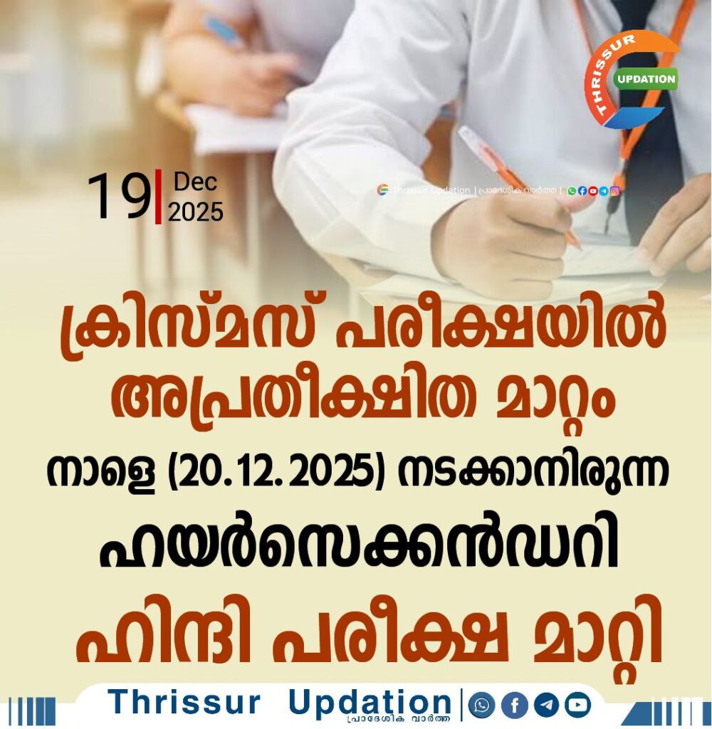 സംസ്ഥാനത്ത് അപ്രതീക്ഷിത പരീക്ഷാ മാറ്റം. നാളെ നടക്കാനിരുന്ന ക്രിസ്മസ് പരീക്ഷ മാറ്റി. ഹയർസെക്കൻഡറി വിഭാഗത്തിൻ്റെ ഹിന്ദി പരീക്ഷയാണ് മാറ്റിയത്.