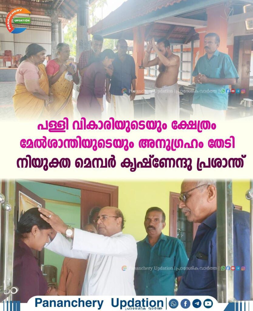 നാളെ ഡിസംബർ 21 ഞായറാഴ്ച രാവിലെ നടക്കുന്ന സത്യപ്രതിജ്ഞക്കുമുമ്പായി തെക്കുംപാടം10ാം വാർഡ് നിയുക്തമെമ്പർ കൃഷ്ണേന്ദു പ്രശാന്ദ് മഞ്ഞക്കുന്ന് സെൻ്റ് തോമസ് ചർച്ചിലെത്തി അനുഗ്രഹം തേടി വികാരി റെവ. ഫാദർ ഫ്രാൻസീസ് തലക്കോട്ടൂർ തലയിൽ കൈവച്ച് പ്രാർത്ഥിച്ച് അനുഗ്രഹിച്ചു തുടർന്ന് കോരംകുളം ക്ഷേത്ര ദർശനം നടത്തി പ്രാർത്ഥിച്ചു മേൽശാന്തി ബ്രഹ്മശ്രീ ശക്തി പ്രസാദ് നമ്പൂതിരി തീർത്ഥവും പ്രസാദവും നൽകി അനുഗ്രഹിച്ചു. സേവാഭാരതി പഞ്ചായത്ത് വൈസ് പ്രസിഡൻ്റ് N S പീതാംബരൻ ബൂത്ത് പ്രസിഡൻ്റ് ബിജു കൊല്ലമറ്റം NDA ഭാരവാഹികളായ വിജയൻ കമ്പിളി കേശവൻ കരുമത്തിൽ എന്നിവരും സംഘത്തിലുണ്ടായിരുന്നു.