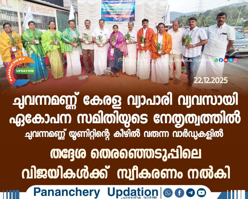 കേരള വ്യാപാരി വ്യവസായി ഏകോപന സമിതി ചുവന്നമണ്ണ് യൂണിറ്റിന്റെ കീഴിൽ വരുന്ന വാർഡുകളിൽ തദ്ദേശ തെരഞ്ഞെടുപ്പിൽ വിജയികൾ ആയിട്ടുള്ള വർക്ക് സ്വീകരണം നൽകി മൂന്നാം വാർഡിൽ നിന്ന് വിജയിച്ച അജു തോമസ് ( യൂണിറ്റിന് തുടക്കം കുറിച്ച വ്യക്തി)നാലാം വാർഡിൽ നിന്ന് വിജയിച്ച മീനു ടീച്ചർ അഞ്ചാം വാർഡിൽ നിന്ന് വിജയിച്ച അനൂപ് ആറാം വാർഡിൽ നിന്ന് വിജയിച്ച ഡിനാ മോൾ എട്ടാം വാർഡിൽ നിന്ന് വിജയിച്ച കെ പി ചാക്കോച്ചൻഒമ്പതാം വാർഡിൽ നിന്ന് വിജയിച്ച സോഫി ജിജിപത്താം വാർഡിൽ നിന്ന് വിജയിച്ച കൃഷ്ണേന്ദു എന്നിവർക്കാണ് സ്വീകരണം നൽകിയത് കേരള വ്യാപാരി വ്യവസായി ഏകോപനസമിതി ചുവന്നമണ്ണ് യൂണിറ്റിന്റെ പ്രസിഡൻ്റ് ജോസ് വല്ലൂരാൻ്റെ അദ്ധ്യഷതയിൽ കൂടിയ സ്വീകരണ യോഗം കേരള വ്യാപാരി വ്യവസായി ഏകോപന സമിതി ജില്ലാ ജനറൽ സെക്രട്ടറിയുംഒല്ലൂർ നിയോജകമണ്ഡലം ചെയർമാനുമായ ബിജു എടക്കളത്തൂർ ഉദ്ഘാടനം ചെയ്തു ഒല്ലൂരിന്റെ കൺവീനർ ശേഖരേട്ടൻ വ്യാപാരി വ്യവസായി ഏകോപന സമിതി ചുവന്നമണ്ണ യൂണിറ്റ് എക്സിക്യൂട്ടീവ് കമ്മിറ്റി മെമ്പർ മത്തായി കേരളം എന്നിവർ ആശംസകൾ അർപ്പിച്ചു സംസാരിച്ചു യൂണിറ്റിന്റെ സെക്രട്ടറി ലിനേഷ് പി എസ് വന്നു കൂടിയവർക്ക് ഹൃദ്യമായ സ്വാഗതം അർപ്പിച്ചു. കക്ഷിരാഷ്ട്രീയത്തിന് അതീതമായി പ്രവർത്തിക്കുന്ന കേരള വ്യാപാരി വ്യവസായി ഏകോപന സമിതി നൽകിയ സ്നേഹോ പകരത്തിനും സ്വീകരണത്തിനും നന്ദി പറഞ്ഞുകൊണ്ട് കെ പി ചാക്കോച്ചൻ മറുപടി പ്രസംഗം നടത്തി. വ്യാപാരികൾ നേരിടുന്ന പ്രശ്നങ്ങളിൽ ഉചിതമായ രീതിയിൽ ഇടപെടുമെന്ന് മറുപടി പറഞ്ഞു.