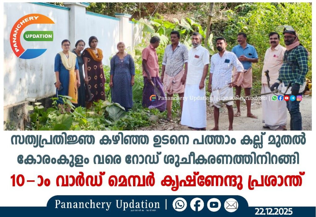 സത്യപ്രതിജ്ഞയും യോഗവും കഴിഞ്ഞയുടൻ 10ാം വാർഡ് മെമ്പർ കൃഷ്ണേന്ദു പ്രശാന്ദ് എത്തിയത് റോഡ് ശുചീകരണത്തിന് നേതൃത്വം കൊടുക്കാൻ പത്താം കല്ല് മുതൽ കോരംകുളംവരേയുള്ള റോഡിൻ്റെ ഇരുവശവും പുല്ലും ചെടികളും വളർന്ന് കാൽ നടയാത്രകാർക്കും വാഹന യാത്രകാർക്കും വലിയ പ്രയാസമായി ഏറെനാളായി ശ്രദ്ധിക്കാതെ കാട് മൂടി കിടക്കുകയായിരുന്ന റോഡാണ് കൃഷ്ണേന്ദുവിൻ്റെ നേതൃത്വത്തിൽ NDA പ്രവർത്തകർ ശുചീകരിച്ചത്. ബൂത്ത് പ്രസിഡൻ്റ് ബിജു കൊല്ലമറ്റം, കണ്ണദാസ്, ഹരിദാസ്, സതീഷ് മേലുവീട്ടിൽ അജി,രവീന്ദ്രൻ, ജയൻ കണ്ടം പുള്ളി തുടങ്ങിയവരും പ്രവർത്തകരും പങ്കെടുത്തു.