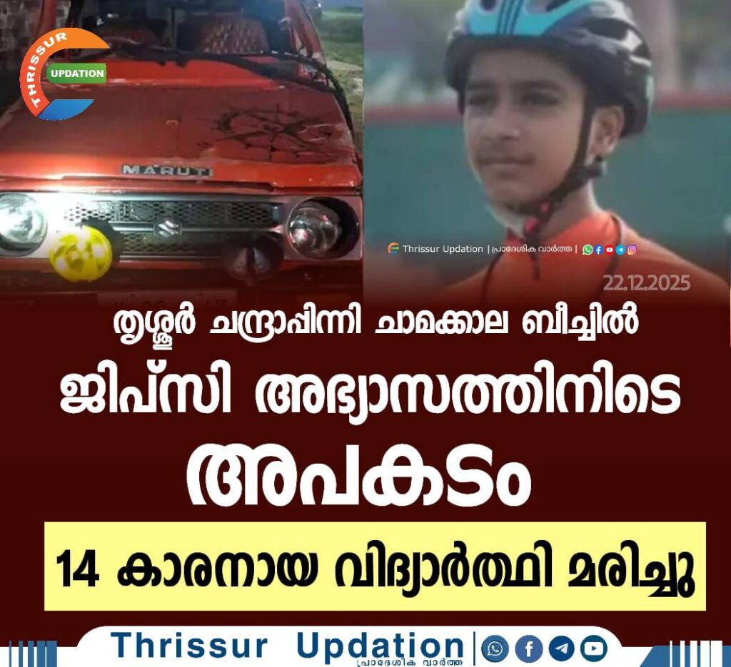തൃശ്ശൂർ ചന്ദ്രാപ്പിന്നി ചാമക്കാല ബീച്ചിൽ ജിപ്സി അഭ്യാസത്തിനിടെ അപകടം. 14 കാരനായ വിദ്യാർത്ഥി മരിച്ചു.
