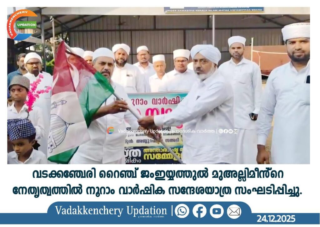 സമസ്ത കേരള ജംഇയ്യത്തുൽ ഉലമയുടെ നൂറാം വാർഷികത്തോടനുബന്ധിച്ച് വടക്കഞ്ചേരി റൈഞ്ച് ജംഇയ്യത്തുൽ മുഅല്ലിമീൻ്റെ നേതൃത്വത്തിൽ സന്ദേശയാത്ര സംഘടിപ്പിച്ചു.