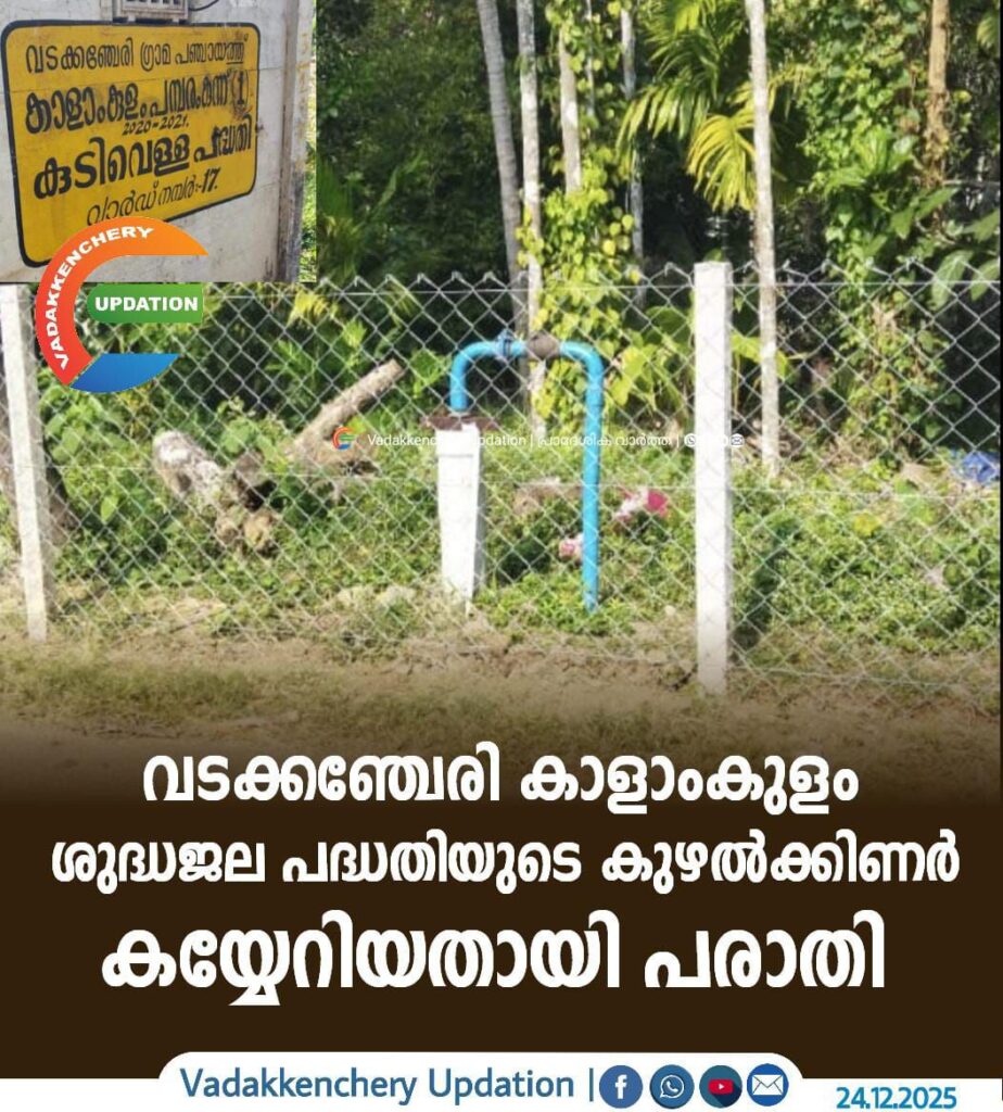 കാളാംകുളം ശുദ്ധജല പദ്ധതിയുടെ കുഴൽക്കിണർ ഉൾപ്പെടുന്ന സ്ഥലം സ്വകാര്യ വ്യക്തി കയ്യേറിയതായി പരാതി. വടക്കഞ്ചേരി-കണക്കൻതുരുത്തി റോഡിൽ കാളാംകുളത്തിനും കണക്കൻതുരുത്തിക്കും ഇടയിൽ പാതയോരത്തുള്ള കുഴൽ ക്കിണറിന്റെ സ്ഥലമാണ് കയ്യേറിയിരിക്കുന്നത്. റോഡിൻ്റെ സ്ഥലം ഉൾപ്പെടെയുള്ള ഭാഗം കമ്പിവേലിയിട്ട് കയ്യേറിയെന്നാണ് നാട്ടുകാരുടെ പരാതി. ഇതു സംബന്ധിച്ച് ജില്ലാ കലക്ടർ, പൊതുമ രാമത്ത് വകുപ്പ്, വടക്കഞ്ചേരി പഞ്ചായത്ത് എന്നിവിടങ്ങളിൽ പരാതി നൽകിയതായി പ്രദേശ വാസികൾ പറഞ്ഞു.