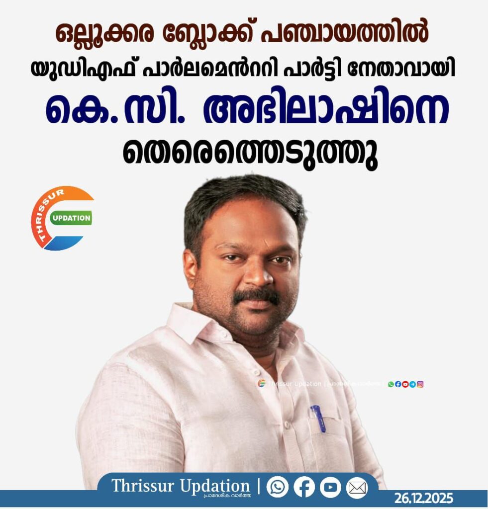 ഒല്ലൂക്കര ബ്ലോക്ക് പഞ്ചായത്തിൽ യുഡിഎഫ് പാർലമെൻററി പാർട്ടി നേതാവായി കെ.സി. അഭിലാഷിനെ തെരെത്തെടുത്തു