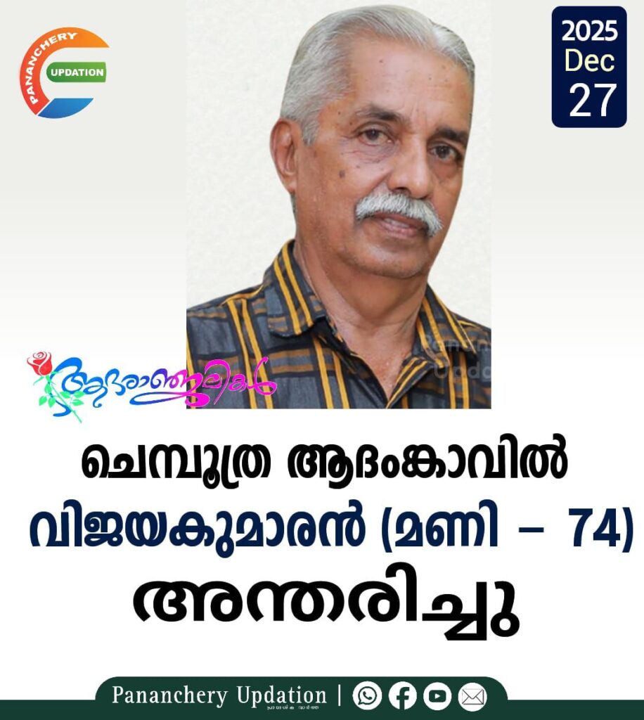 ചെമ്പൂത്ര പരേതനായ തെക്കൂട്ട് ഉണ്ണിനായർ മകൻ ആദംങ്കാവിൽ വിജയകുമാരൻ(മണി – 74) അന്തരിച്ചു. സംസ്കാരം ഇന്ന് (27.12.2025- ശനി)