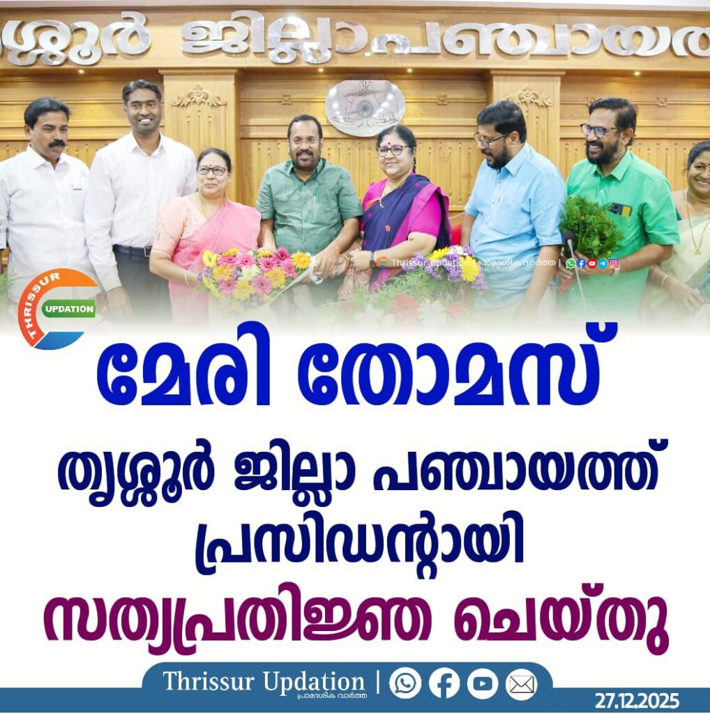 തൃശ്ശൂര് ജില്ലാ പഞ്ചായത്ത് 12-ാമത്തെ പ്രസിഡന്റായി വാഴാനി ഡിവിഷനില് നിന്നുള്ള മേരി തോമസ് തിരഞ്ഞെടുക്കപ്പെട്ടു. ജില്ലാ പഞ്ചായത്ത് കോണ്ഫറന്സ് ഹാളില് നടന്ന തിരഞ്ഞെടുപ്പില് ആകെ പോള് ചെയ്ത 30 വോട്ടുകളില് 21 വോട്ടുകളും നേടിയാണ് മേരി തോമസ് പ്രസിഡന്റ് സ്ഥാനത്തെത്തിയത്. ഫലപ്രഖ്യാപനത്തിന് ശേഷം വരണാധികാരിയായ ജില്ലാ കളക്ടര് അര്ജുന് പാണ്ഡ്യന് പ്രസിഡന്റിന് സത്യവാചകം ചൊല്ലിക്കൊടുത്തു.