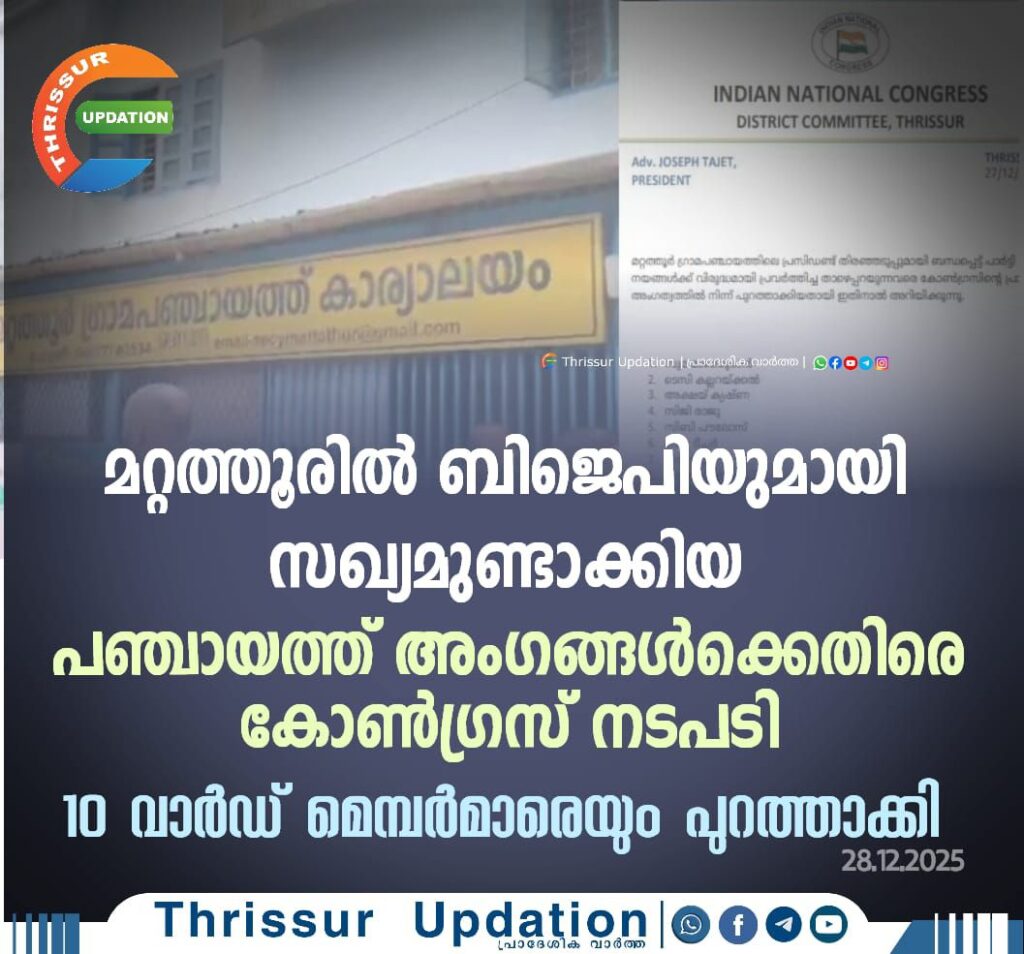 തൃശൂര് മറ്റത്തൂരില് ബിജെപിയുമായി സഖ്യമുണ്ടാക്കിയ പഞ്ചായത്ത് അംഗങ്ങള്ക്കെതിരെ നടപടിയെടുത്ത് കോണ്ഗ്രസ്. 10 വാര്ഡ് മെമ്പര്മാരെയും പാര്ട്ടിയില് നിന്ന് പുറത്താക്കി. സംഭവത്തില് രണ്ട് പ്രാദേശിക നേതാക്കളെയും പ്രാഥമിക അംഗത്വത്തില് നിന്ന് പുറത്താക്കിയിരുന്നു.