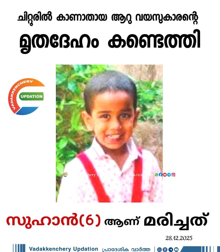 പാലക്കാട് ചിറ്റൂരിൽ കാണാതായ ആറു വയസുകാരൻ സുഹാന്റെ മൃതദേഹം കണ്ടെത്തി. പ്രദേശത്തെ കുളത്തിൽ നിന്നാണ് മൃതദേഹം കണ്ടെത്തിയത്. അനസ്-തൗഹിത ദമ്പതികളുടെ മകനാണ് സുഹാൻ. ഇന്നലെ രാവിലെ 11 മണി മുതലാണ് സുഹാനെ കാണാതായത്. കുട്ടിയെ കണ്ടെത്താനായി വ്യാപക തിരച്ചില് നടത്തിയിരുന്നു. ഇന്ന് രാവിലെ തിരച്ചില് നടത്തുന്നതിനിടെയാണ് കുട്ടിയുടെ മൃതദേഹം കണ്ടെത്തിയത്.