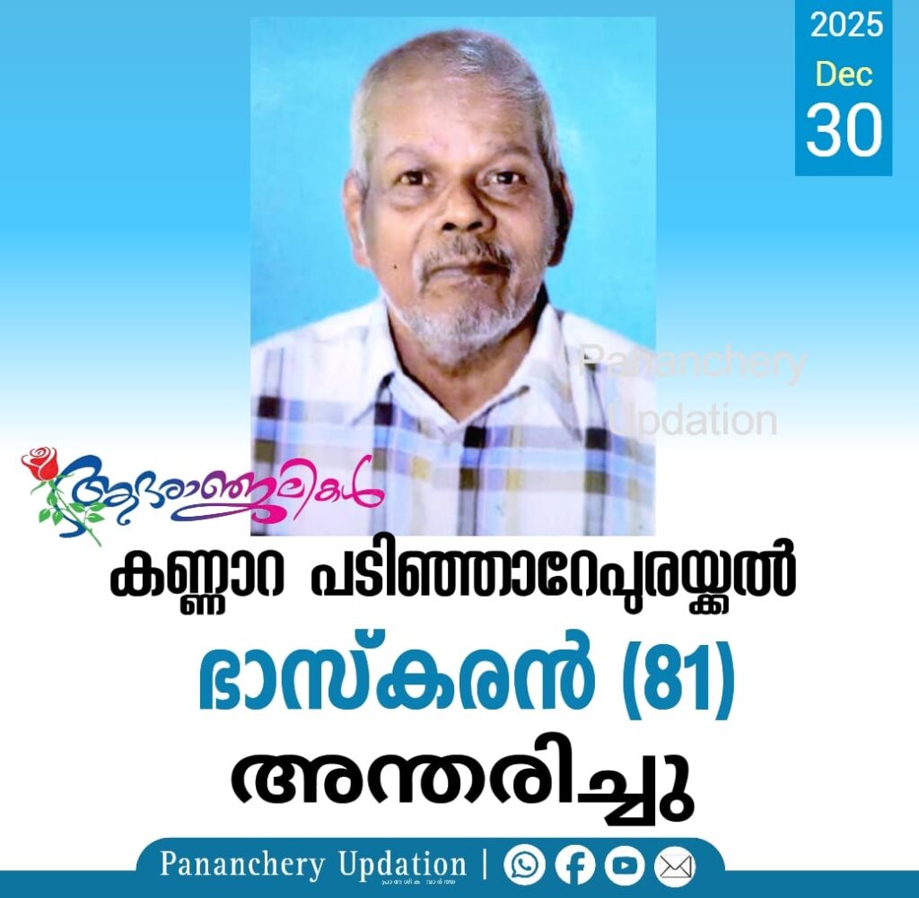 കണ്ണാറ പടിഞ്ഞാറേപുരയ്ക്കൽ ഭാസ്കരൻ (പൊന്നു കരുവാൻ – 81) അന്തരിച്ചു. ഭാര്യ: തങ്ക .