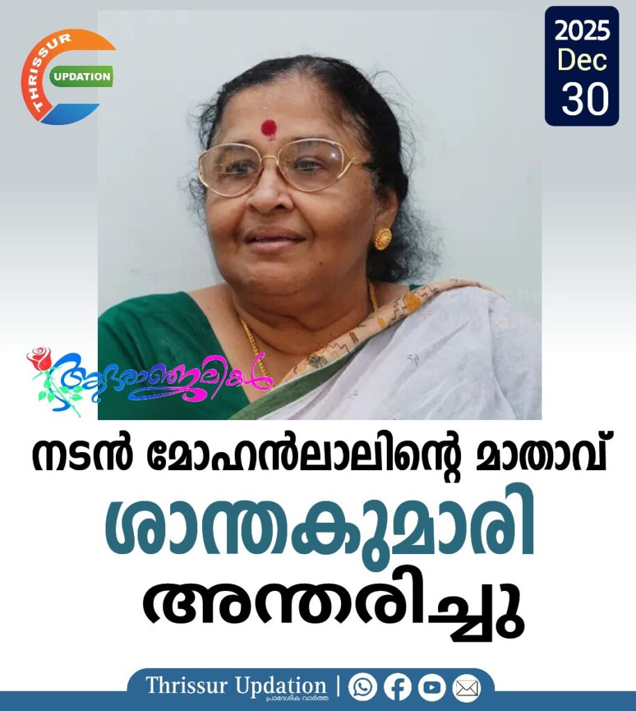 90 വയസ്സായിരുന്നു.കൊച്ചി എളമക്കരയിലെ വീട്ടിൽ വെച്ചായിരുന്നു വേർപാട്. പക്ഷാഘാതത്തെ തുടർന്ന് 10 വർഷമായി ചികിത്സയിലായിരുന്നു ശാന്തകുമാരിയമ്മ.മുൻ നിയമസെക്രട്ടറിയായിരുന്ന പരേതനായ വിശ്വനാഥൻ നായരാണ് ഭർത്താവ്. പരേതനായ പ്യാരേ ലാൽ ആണ് മറ്റൊരു മകൻ. സംസ്കാരം നാളെ. ആരോഗ്യപ്രശ്നങ്ങളെത്തുടർന്ന് കുറച്ചുകാലമായി എളമക്കരയിലാണ് മോഹൻലാലിന്റെ അമ്മ ശാന്തകുമാരി അമ്മ താമസിക്കുന്നത്.