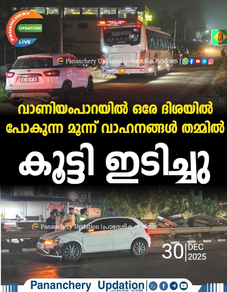 വാണിയംപാറയിൽ ഒരേ ദിശയിൽ പോകുന്ന മൂന്ന് വാഹനങ്ങൾ തമ്മിൽ കൂട്ടി ഇടിച്ചു