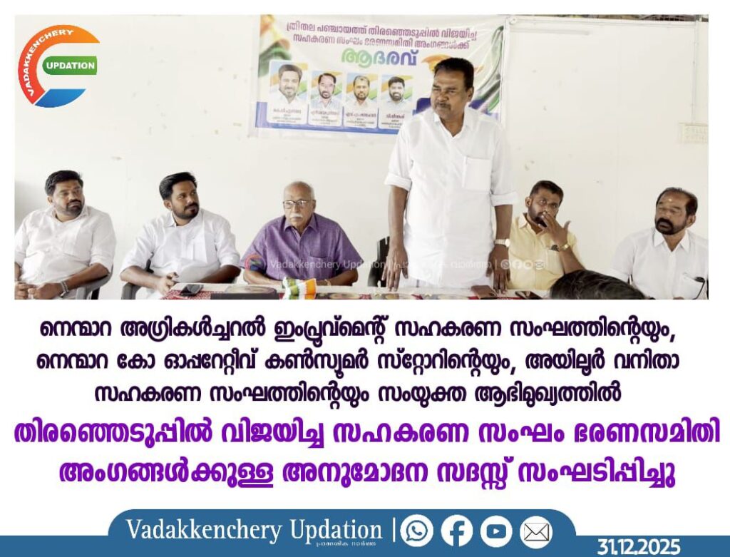 നെന്മാറ അഗ്രികൾച്ചറൽ ഇംപ്രൂവ്മെന്റ് സഹകരണ സംഘത്തിന്റെയും, നെന്മാറ കോ ഓപ്പറേറ്റീവ് കൺസ്യൂമർ സ്റ്റോറിന്റെയും, അയിലൂർ വനിതാ സഹകരണ സംഘത്തിന്റെയും സംയുക്ത ആഭിമുഖ്യത്തിൽ ത്രിതല പഞ്ചായത്ത് തിരഞ്ഞെടുപ്പിൽ വിജയിച്ച സഹകരണ സംഘം ഭരണസമിതി അംഗങ്ങൾക്കുള്ള അനുമോദന സദസ്സ് സംഘടിപ്പിച്ചു.