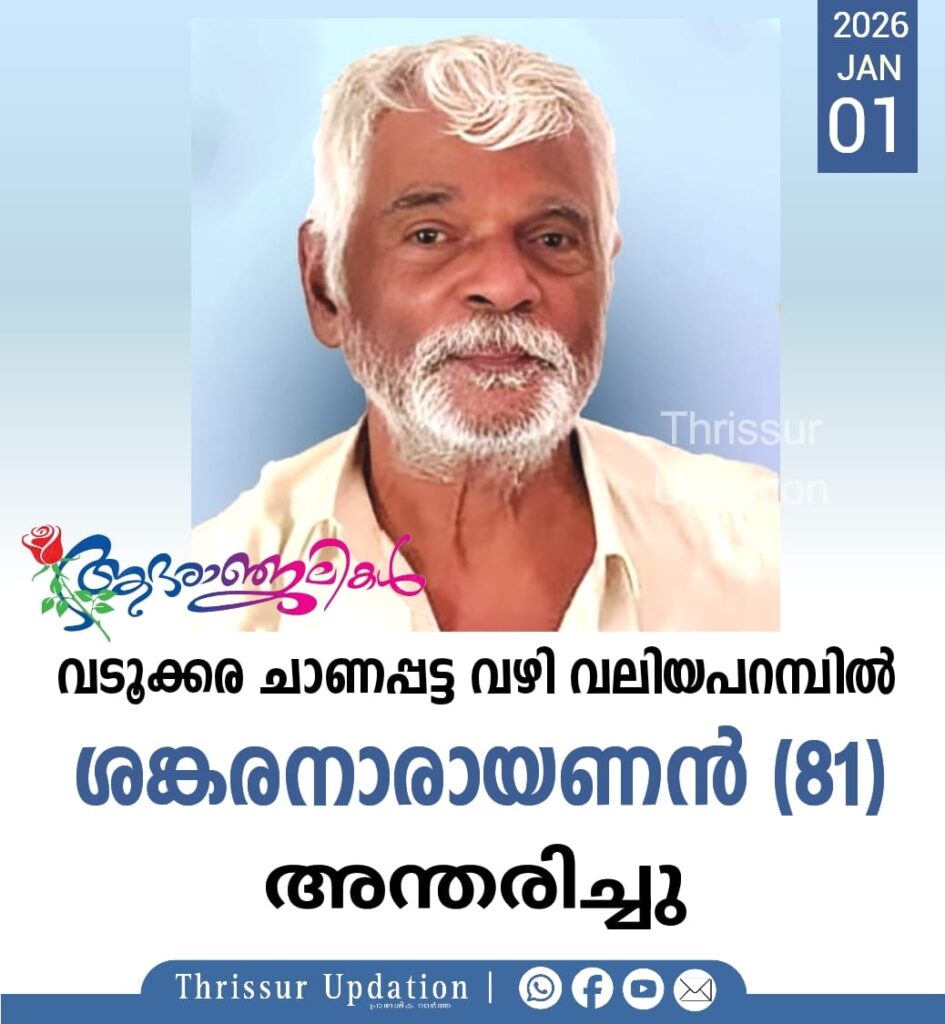 വടൂക്കര ചാണപ്പട്ട വഴി വലിയപറമ്പിൽ ശങ്കരനാരായണൻ (81) അന്തരിച്ചു. സംസ്ക്കാരം ഇന്ന് (01.01.2026 ) വടൂക്കര ശ്രീ നാരായണത്തിൽ നടക്കും . ഭാര്യ : മണി മക്കൾ : ഗീത, ജിഷ , റോഷൻ.