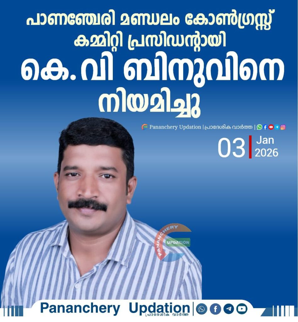 പാണഞ്ചേരി മണ്ഡലം കോൺഗ്രസ്സ് കമ്മിറ്റി പ്രസിഡന്റായി കെ.വി ബിനുവിനെ നിയമിച്ചു
