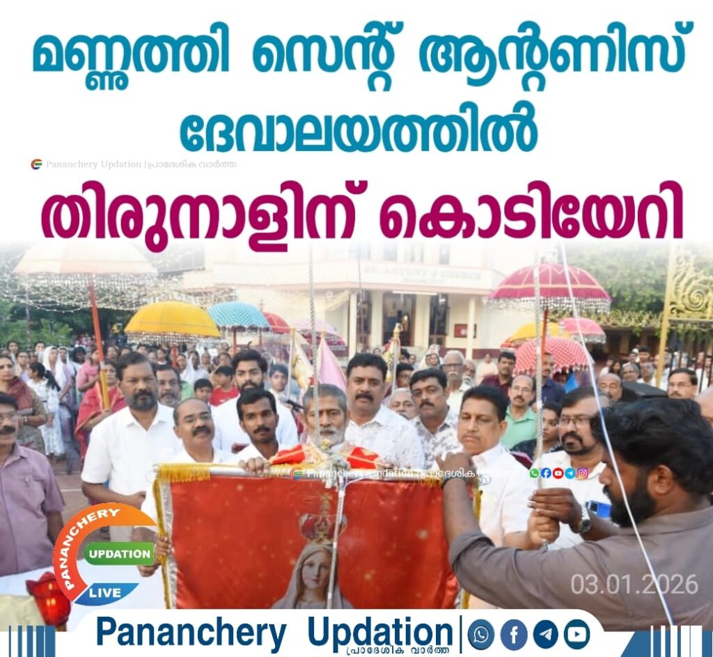 മണ്ണുത്തി സെന്റ് ആന്റണിസ് ദേവാലയത്തിലെ തിരുനാളിന് കൊടിയേറി. വികാരി ഫാ. ഡേവിസ് ചിറമ്മൽ കൊടിയേറ്റം നിർവ്വഹിച്ചു. ജനുവരി 9, 10, 11, 12, 13 തീയതികളിലാണ് തിരുനാൾ ആഘോഷങ്ങൾ നടക്കുക.