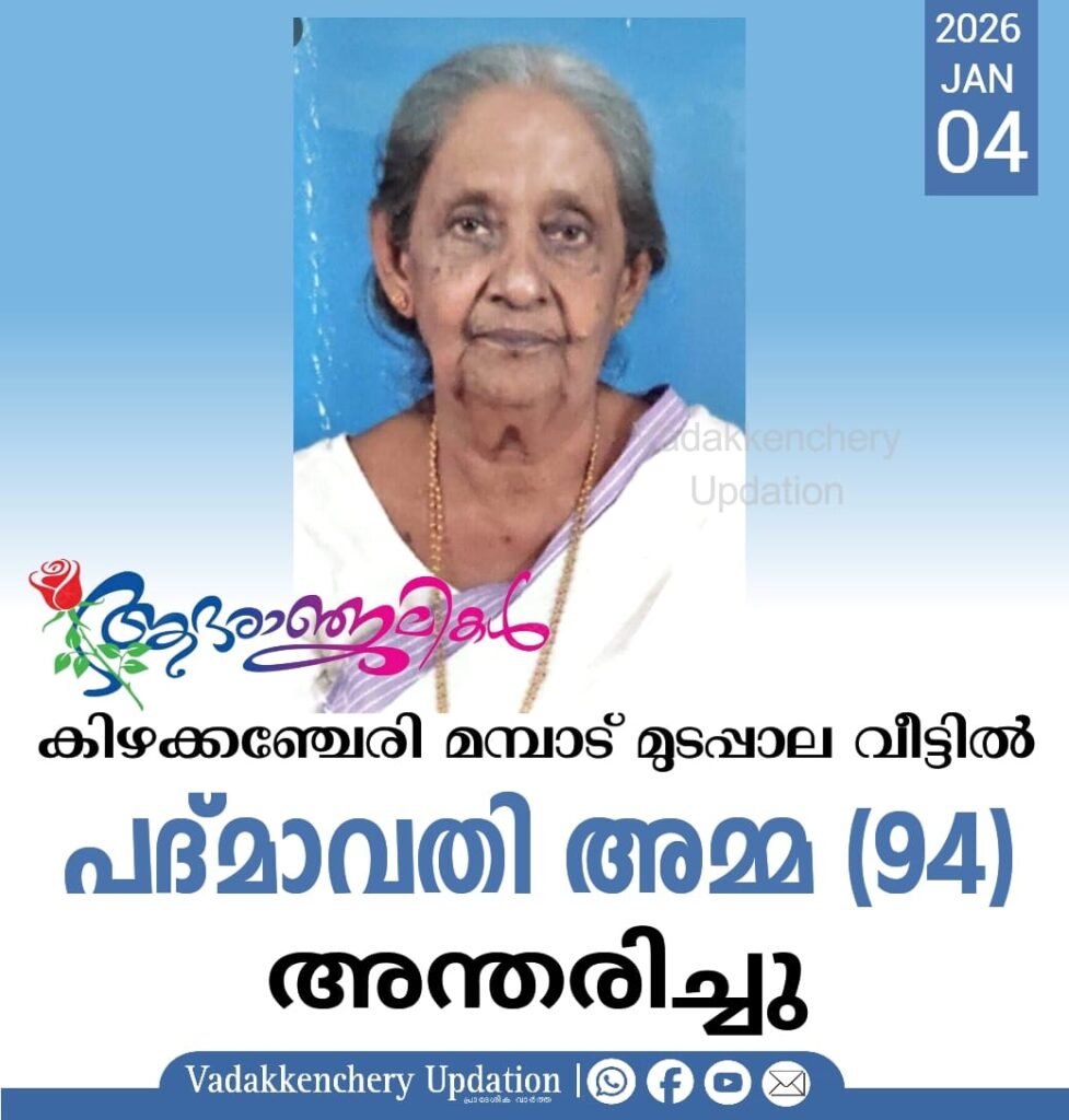 കിഴക്കഞ്ചേരി മമ്പാട് മുടപ്പാല വീട്ടിൽ പരേതനായ രാമനുണ്ണിയുടെ ഭാര്യ പദ്മാവതി അമ്മ (94) അന്തരിച്ചു. സംസ്ക്കാരം നാളെ (05.01.2026) രാവിലെ 11 മണിക്ക് ഐവർമഠത്തിൽ വെച്ച്.