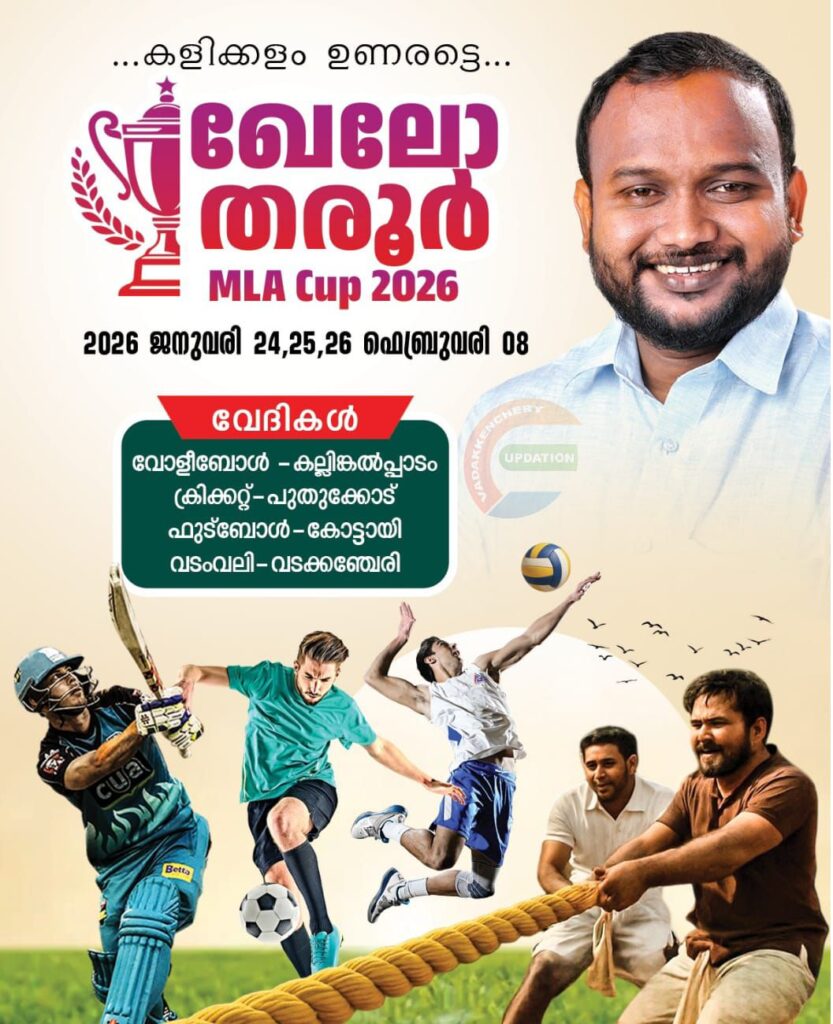 തരൂർ നിയോജകമണ്ഡലത്തിൽ 2026 വർഷത്തെ കായിക മാമാങ്കത്തിന് തുടക്കം കുറിക്കുന്നു. ഖേലോ തരൂർ എം.എൽ.എ കപ്പ് 2026 ജനുവരി 24,25, 26 & ഫെബ്രുവരി 8 തീയതികളിൽ വിവിധ പഞ്ചായത്ത്
