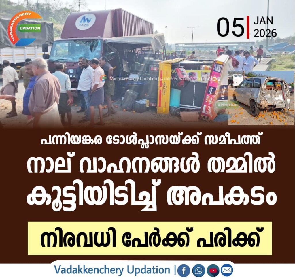 പന്നിയങ്കര ടോൾപ്ലാസയ്ക്ക് സമീപത്ത് 4 വാഹനങ്ങൾ തമ്മിൽ കൂട്ടിയിച്ച് അപകടം; നിരവധി പേർക്ക് പരിക്ക്