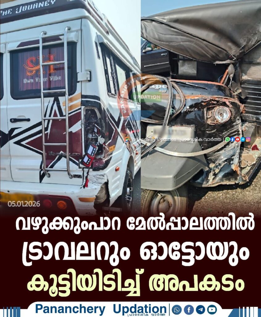 തൃശ്ശൂരിൽ നിന്ന് പാലക്കാട് ദിശയിലേക്ക് പോകുന്ന ദേശീയപാതയിൽ വഴുക്കുംപാറ പാലത്തിന്മേൽ ഒരേ പാതയിൽ സഞ്ചരിച്ച വാഹനങ്ങൾ തമ്മിൽ കൂട്ടിയിടിച്ച് അപകടം. ഓട്ടോയും ട്രാവലറും കൂട്ടിയിടിച്ചുണ്ടായ അപകടത്തിൽ ഓട്ടോ ഡ്രൈവറുടെ കാലിന് സാരമായ പരിക്കേറ്റു. ഇന്നലെ ഉച്ചയോടെയാണ് അപകടം ഉണ്ടായത്.