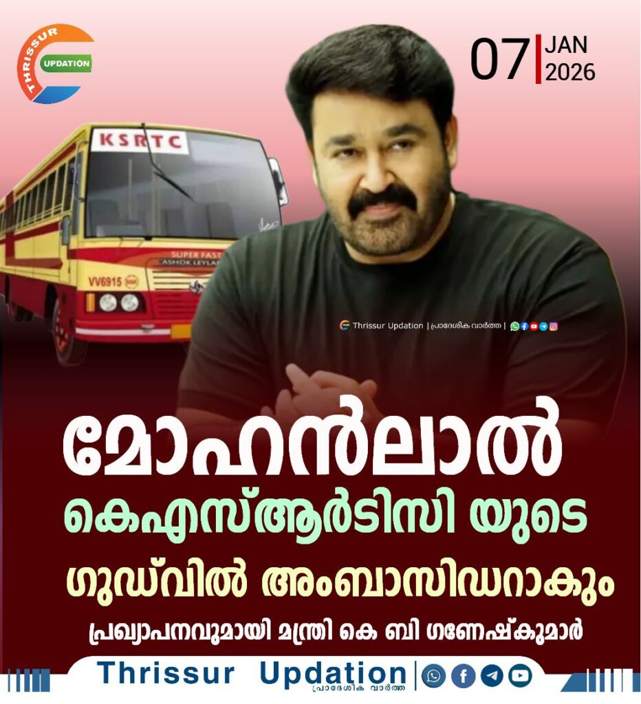 നടൻ മോഹൻലാൽ കെഎസ്ആർടിസിയുടെ ഗുഡ്വിൽ അംബാസിഡറാകുമെന്ന് ഗതാഗത വകുപ്പ് മന്ത്രി കെ ബി ഗണേഷ് കുമാർ. ഇതിനായി പ്രതിഫലം ഉണ്ടാകില്ലെന്നും താരം സമ്മതം അറിയിച്ചതായും ഗണേഷ് കുമാർ പറഞ്ഞു. കെഎസ്ആർടിസിയുടെ ചരിത്ര വരുമാന നേട്ടം കൂട്ടായ സഹകരണ പ്രവർത്തനത്തിന്റെ വിജയമാണെന്നും സർക്കാരിന്റെ മികച്ച നേട്ടമായി ഇതിനെ വിശേഷിപ്പിക്കാം. എന്നന്നേക്കുമായി അടച്ചുപൂട്ടലിലേക്ക് പോയ കെഎസ്ആർടിസിയെ ഇടതു മുന്നണി സർക്കാർ തിരിച്ചു കൊണ്ടുവരികയാണെന്നും അദ്ദേഹം പറഞ്ഞു.ജനുവരി 5ന് 13.01 കോടി രൂപ വരുമാനം നേടിക്കൊണ്ട് ചരിത്രത്തിലെ ഏറ്റവും വലിയ പ്രതിദിന ടിക്കറ്റ് വരുമാനം കെഎസ്ആർടിസി സ്വന്തമാക്കിയതിന് പിന്നാലെയാണ് മന്ത്രിയുടെ പ്രതികരണം. കെഎസ്ആർടിസിക്ക് ആകെയുള്ളത് 5,502 ബസുകളാണ്. അതിൽ ഇന്നലെ ഓടിയത് 4,852 ബസുകളാണ്. ശബരിമല സീസൺ ആയത് കൊണ്ടല്ല നേട്ടം. ഇടവഴിയിലും നടവഴിയിലും ബസ് ഓടിച്ചതിന്റെ വിജയമാണിത്. കെഎസ്ആർടിസി ഡെഡ് മൈലേജ് കുറച്ചു. ധനവകുപ്പിന്റെയും സർക്കാരിന്റെയും പൂർണ സഹായം ലഭിച്ചു. ഇന്ത്യയിലെ ആദ്യ ഡിജിറ്റൽ കോർപ്പറേഷൻ കെഎസ്ആർടിസിയാണ്. ഷെഡ്യൂൾ വരെ തീരുമാനിക്കുന്നത് എ ഐ വിദ്യ കൊണ്ടാണ്. റൂട്ടുകൾ കൂടുതൽ ശാസ്ത്രീയമാക്കി. എ ഐ സോഫ്റ്റ്വെയർ തന്റെ തലയിലെ ആശയമാണെന്നും അഭിമാനത്തോടെ അത് പറയുന്നുവെന്നും മന്ത്രി വ്യക്തമാക്കി.വണ്ടികളുടെ ക്ലീനിംഗുമായി ബന്ധപ്പെട്ട് കുടുംബ ശ്രീയുമായി ചർച്ച നടക്കുന്നുണ്ട്. ജനങ്ങൾ ആഗ്രഹിച്ച കാര്യങ്ങൾ കെഎസ്ആർടിസി നടപ്പിലാക്കിയെന്നും അദ്ദേഹം പറഞ്ഞു. ശബരിമല മകരവിളക്കിനോടനുബന്ധിച്ച് 800 ബസ് വേണമെന്ന് ദേവസ്വം ബോർഡ് ആവശ്യപ്പെട്ടിട്ടുണ്ട്. കെഎസ്ആർടിസി 1,000 ബസ് ഓപ്പറേറ്റ് ചെയ്യും. നിലവിൽ 60 മിനിറ്റിൽ (മണിക്കൂറിൽ) 100 വണ്ടികൾ ശബരിമലയിൽ ഓപ്പറേറ്റ് ചെയ്യുന്നുണ്ട്. ഇത് ഗിന്നസ് നേട്ടമായി കണക്കാക്കാമെന്നും മന്ത്രി പറഞ്ഞു.