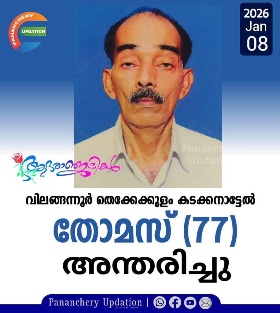 കോൺഗ്രസ്സ് പാണഞ്ചേരി മണ്ഡലം പ്രസിഡൻ്റ് ബിനു കെ.വി യുടെ ഭാര്യാ പിതാവ് വിലങ്ങന്നൂർ തെക്കേക്കുളം കടക്കനാട്ടേൽ വർഗ്ഗീസ് മകൻ തോമസ് (77) അന്തരിച്ചു. വിലങ്ങന്നൂരിലെ വ്യാപാരിയാണ്. സംസ്കാരം ഇന്ന് (08-01-2026- വ്യാഴം) വൈകിട്ട് 4 മണിക്ക് വിലങ്ങന്നൂർ സെൻ്റ് ജോർജ്ജ് മലങ്കര കത്തോലിക്ക പള്ളിയിൽ