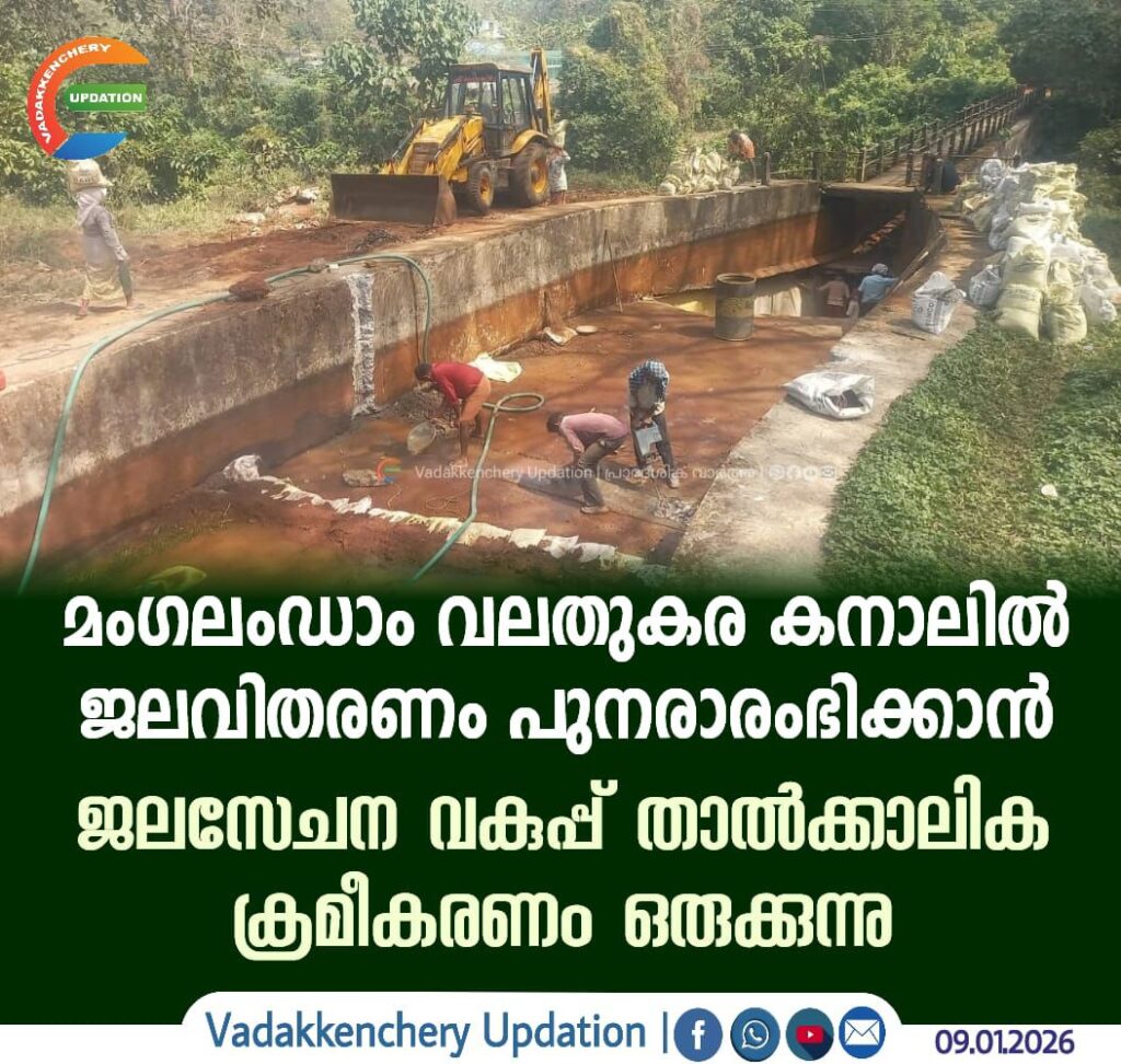 കനാൽ ഇടിഞ്ഞതാണ് ജലവിതരണം നിർത്തിവച്ച മംഗലംഡാം വലതുകര കനാലിൽ താൽക്കാലിക സംവിധാന മൊരുക്കി ജലവിതരണം പുനരാരംഭിക്കാനുള്ള തയാറെടുപ്പിലാണു ജലസേചന വകുപ്പ്. വലതുകര കനാൽ കടന്നുപോകുന്ന ചെറുകുന്നം പുഴയുടെ കുറുകെയുള്ള പാലത്തിൻ്റെ തുടക്കഭാഗ മാണ് 15 അടിയോളം ഇടിഞ്ഞു താഴ്ന്നത്. ഉടൻ കനാൽ അടച്ചു.
