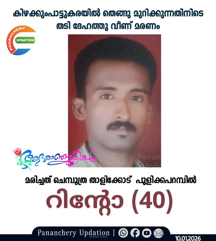 ചെമ്പൂത്ര താളിക്കോട് താമസിക്കുന്ന പുളിക്കപറമ്പിൽ ഫിലിപ്പിന്റെയും ലീലാമ്മയുടെയും മകൻ റിൻ്റോ (40) ആണു മരിച്ചത്. സംസ്കാരം (12.01.2026)/ തിങ്കളാഴ്ച) ഉച്ചക്ക് 3 മണിക്ക് സെന്റ് ഫ്രാൻസിസ് സേവിയേഴ്സ് ഫൊറോന പള്ളിയിൽ. ഇന്നലെ ഉച്ചയോടെയാണ് അപകടം. തെങ്ങു മറിയുന്നതു കണ്ട് ഓടി മാറാൻ ശ്രമി ച്ചെങ്കിലും ഒടിഞ്ഞ് റിന്റോയുടെ ദേഹത്ത് പതിക്കുകയായിരു ന്നു. ഉടൻ ജൂബിലി മിഷൻ ആശുപത്രിയിൽ എത്തിച്ചെങ്കിലും രാത്രിയോടെ മരണപ്പെടുകയായിരുന്നു.