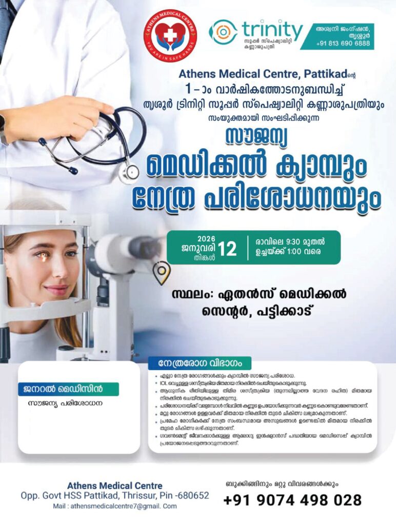 Athens Medical Centre Pattikkad ൻ്റെ 1-ാംവാർഷികത്തോടനുബന്ധിച്ച് തൃശൂർ ട്രിനിറ്റി സൂപ്പർ സ്പെഷ്യാലിറ്റി കണ്ണാശുപത്രിയും സംയുക്തമായി സംഘടിപ്പിക്കുന്ന സൗജന്യ മെഡിക്കൽ ക്യാമ്പും നേത്ര പരിശോധനയും നാളെ (12.01.2026) സംഘടിപ്പിക്കുന്നു