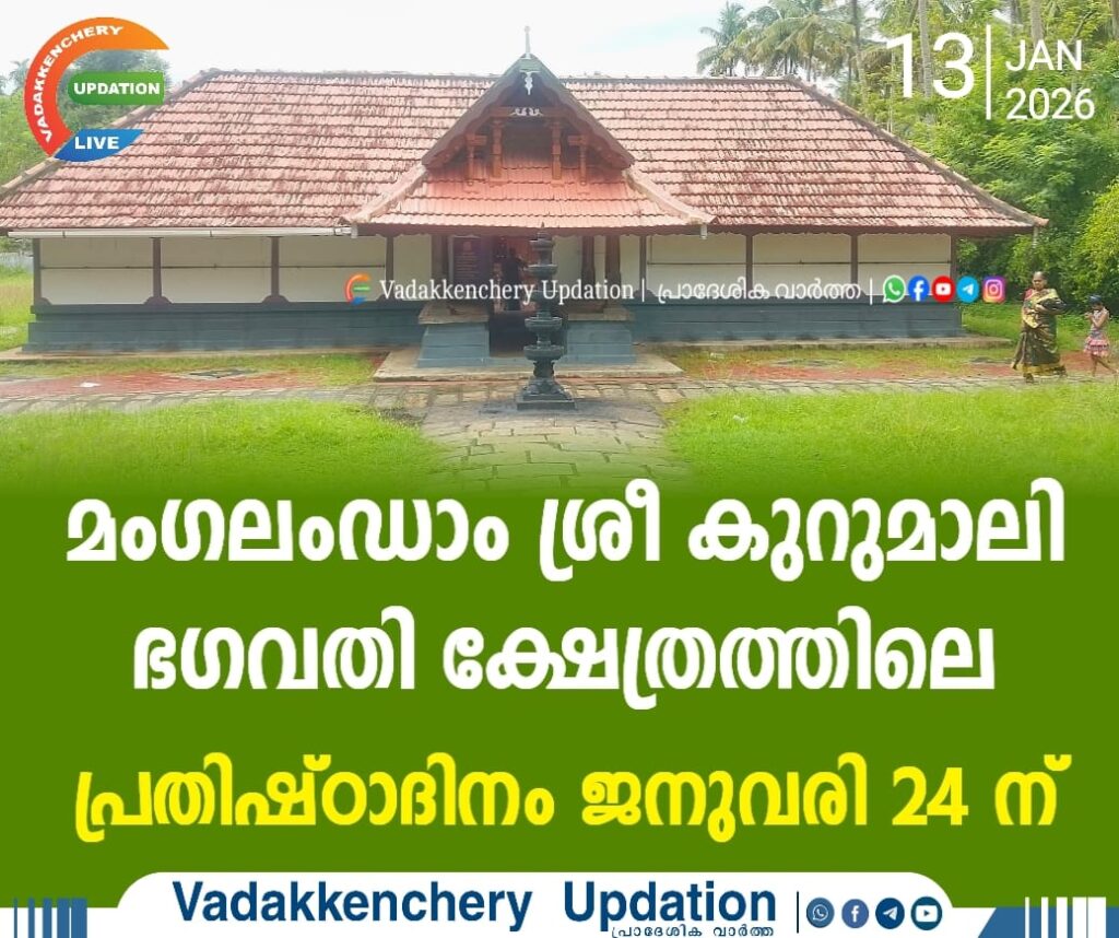 മംഗലംഡാം ശ്രീ കുറുമാലി ഭഗവതി ക്ഷേത്രത്തിലെ പ്രതിഷ്ഠാദിനം 2026 ജനുവരി 24 ന്