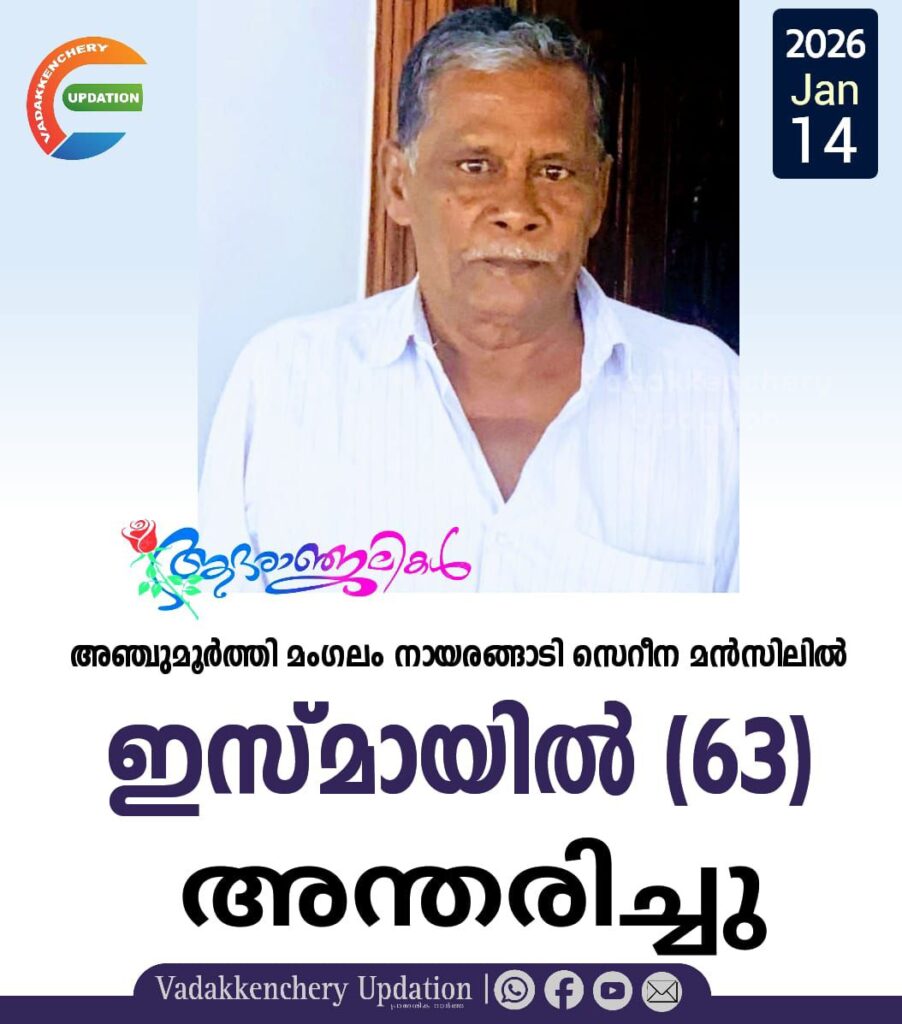 മംഗലംപാലത്ത് ചിപ്സ് കട നട ത്തുന്ന അഞ്ചുമൂർത്തി മംഗലം നായരങ്ങാടി സെറീന മൻസിലിൽ ഇസ്മായിൽ (63) അന്തരിച്ചു. കബറടക്കം ഇന്ന് (14.01.2026-ബുധൻ) 11 ന് വടക്കഞ്ചേരി ഹനഫി പള്ളി കബർസ്ഥാനിൽ. ഭാര്യ: ജമീല. മക്കൾ: അഷറഫ്, ഷെറീന. മരുമകൻ: അബു താഹിർ. സഹോദരങ്ങൾ: സുലൈമാൻ, യൂസഫ്, കമാൽ, ആസിയ, സബൂറ, ഖൈറുന്നിസ.